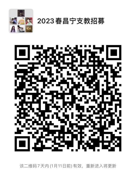 有意参加顶岗支教的研究生同学,经导师和各二级培养单位相关负责人同意后,于1月10日(星期二)下午5点前扫码加入志愿者遴选工作微信群,并按群里公布的渠道提交《PA视讯研究生云南昌宁志愿服务项目报名表》。