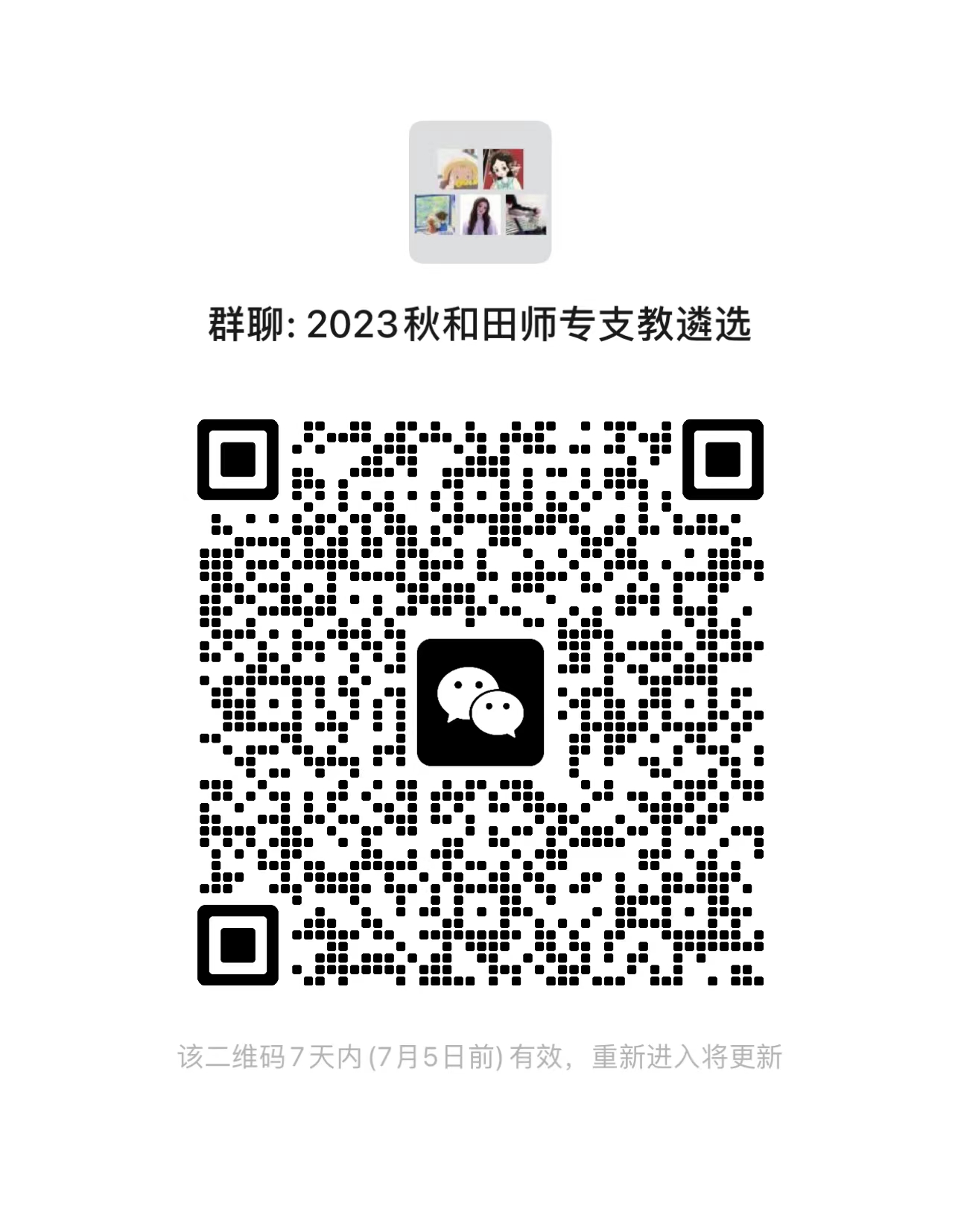 有意参加顶岗支教的研究生同学,报经导师、辅导员和所在培养单位分管领导同意后,于6月30日(星期五)16:00前将《PA视讯和田师专研究生顶岗支教项目报名表》纸质版(需签字盖章)提交至党委研究生工作部管理科(研究生院102办公室),并扫描下方二维码加入微信群以接收后续遴选工作通知。