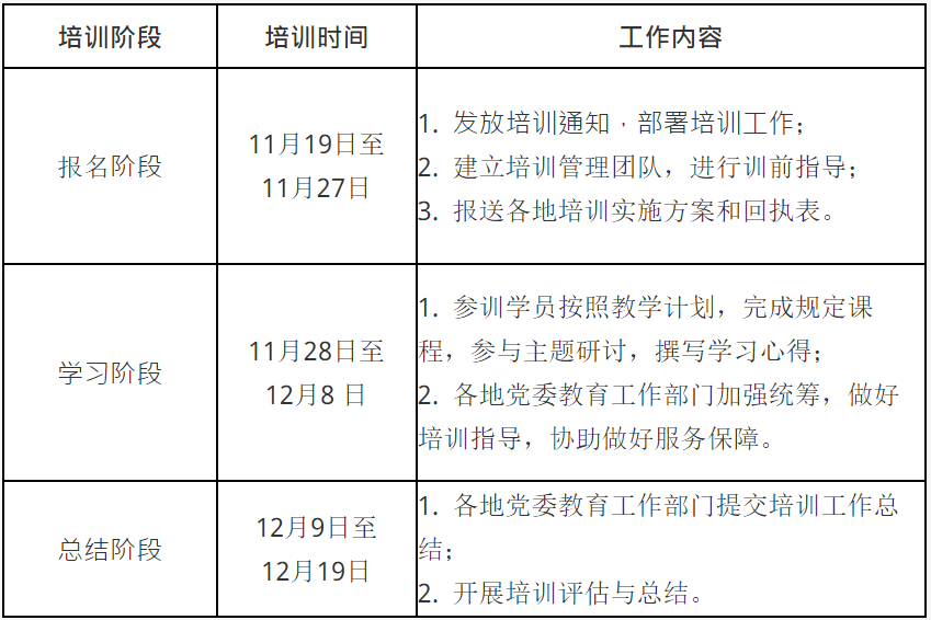 培训时间为2020年11月19日至12月19日,分为报名、学习、总结三个阶段,具体安排见下表:
