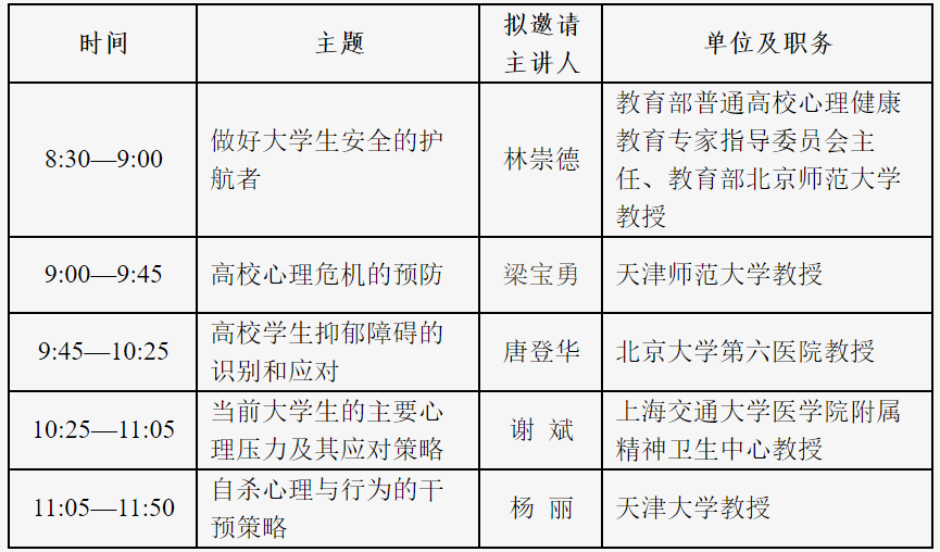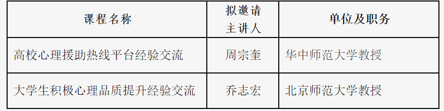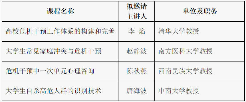 培训根据目标要求与培训主题,充分整合北京师范大学、天津大学、清华大学、北京大学第六医院等高校心理健康教育及医疗系统工作队伍资源,开展心理危机预防干预培训,培训课程包括录播课程、直播课程以及经验交流,课程详见表1、2、3。