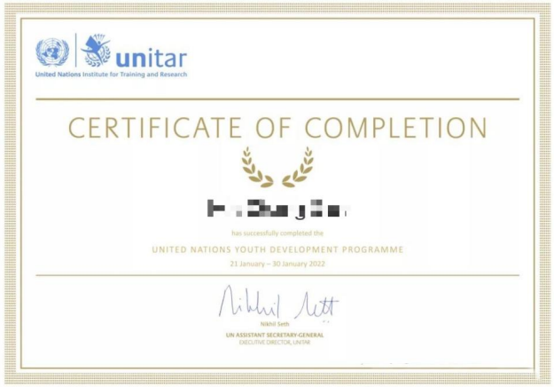 学生顺利完成训练课程后,可获得联合国训练研究所颁发的官方项目证书。