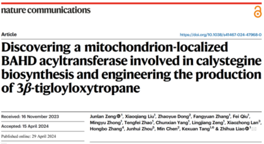 2024年4月29日,生命科学学院2019级植物学博士研究生曾俊岚作为第一作者在《Nature Communications》上发表了题为《Discovering a mitochondrion-localized BAHD acyltransferase involved in calystegine biosynthesis and engineering the production of 3β-tigloyloxytropane》的研究论文。该研究鉴定了一个定位于线粒体的BAHD酰基转移酶(BAHD-AT),即惕佫酰假托品合成酶(3β-Tigloyloxytropane Synthase,TS),该酶催化假托品和剔佫酰CoA合成剔佫酰假托品进而参与打碗花精的生物合成。该研究采用计算生物学和定点突变揭示TS催化机制并改善其催化活性,最后在大肠杆菌中实现了惕佫酰假托品的高效生物制造。该研究进一步完善了托品烷生物碱(TAs)生物合成理论,为假托品酯化物的生物制造提供了必需基因,丰富了对BAHD-AT亚细胞定位和催化机制的认识,并最终实现了神经退行性疾病治疗药物惕佫酰假托品的高效生物制造。