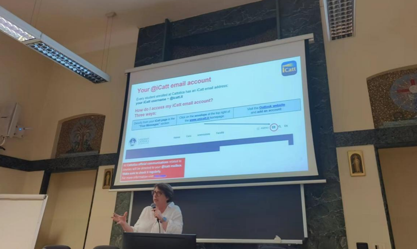初到米兰,圣心大学为研学团准备了热情洋溢的欢迎仪式。在迎新会上,意大利圣心大学国际合作与交流处、国际学生服务高级主管Alicia老师详尽地向大家介绍了圣心大学的建校历史、发展历程以及校园网站的使用方法,还介绍了为夏季国家交流学生提供专门服务的教师团队以及为国际学生提供的全面支持。在老师们的精心安排下,同学们逐渐放松,开始沉浸式体验圣心大学的学习生活氛围。