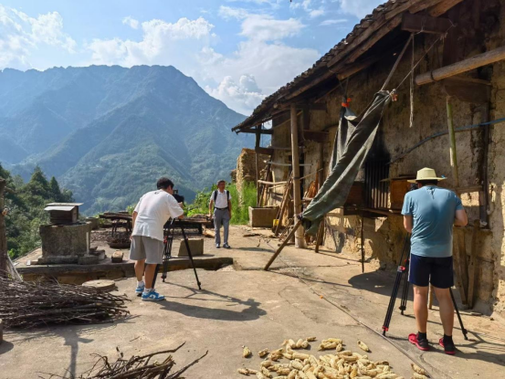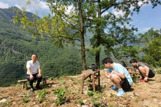 在田坝镇双箭村,团队为了拍摄驻村第一书记廖正步带头修建的乡村产业路,在烈日酷暑中肩挑背负,带着沉重的设备徒步上山拍摄。山上地势陡峭,山路十分难走,但是为了体现驻村工作不易,真实呈现第一书记对乡村振兴工作的艰苦付出,研究生们克服困难,在大山上完成了拍摄。之后拍摄团队前往田坝镇百草村拍摄了第一书记代涛带领村民办厂,发展豆腐柴、面条、天麻产业的事迹。