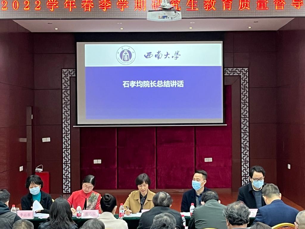 随后,石孝均院长从研究生教育的重要性、新形势下研究生教育事业的新特征、学校开展研究生教育质量督导工作的紧迫性三个方面进行了总结。希望各位委员、专家能够切实落实研究生教育督导检查工作安排,加强毕业论文答辩环节的督导,与二级培养单位携手,共同保障研究生教育质量稳步提升。会议最后,各督导小组开展分组讨论,商议了工作细则与执行方案。