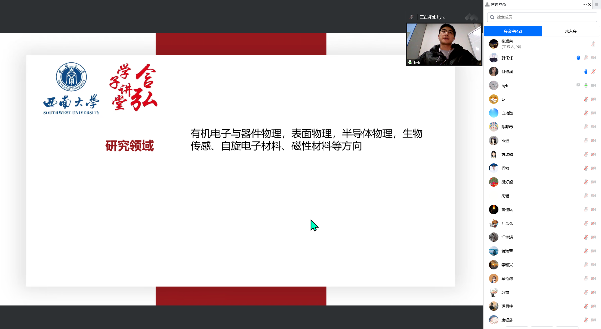 胡远鸿同学首先介绍了凝聚态物理的各大研究领域,然后基于本院的实验室条件详细介绍了本院各课题组近几年的研究方向。接下来,他给大家介绍了研究生期间如何做好个人规划,并着重讲述了自己在做科研时的心得体会。最后,他介绍了凝聚态物理专业的就业前景,并对大家的疑问进行了解答。