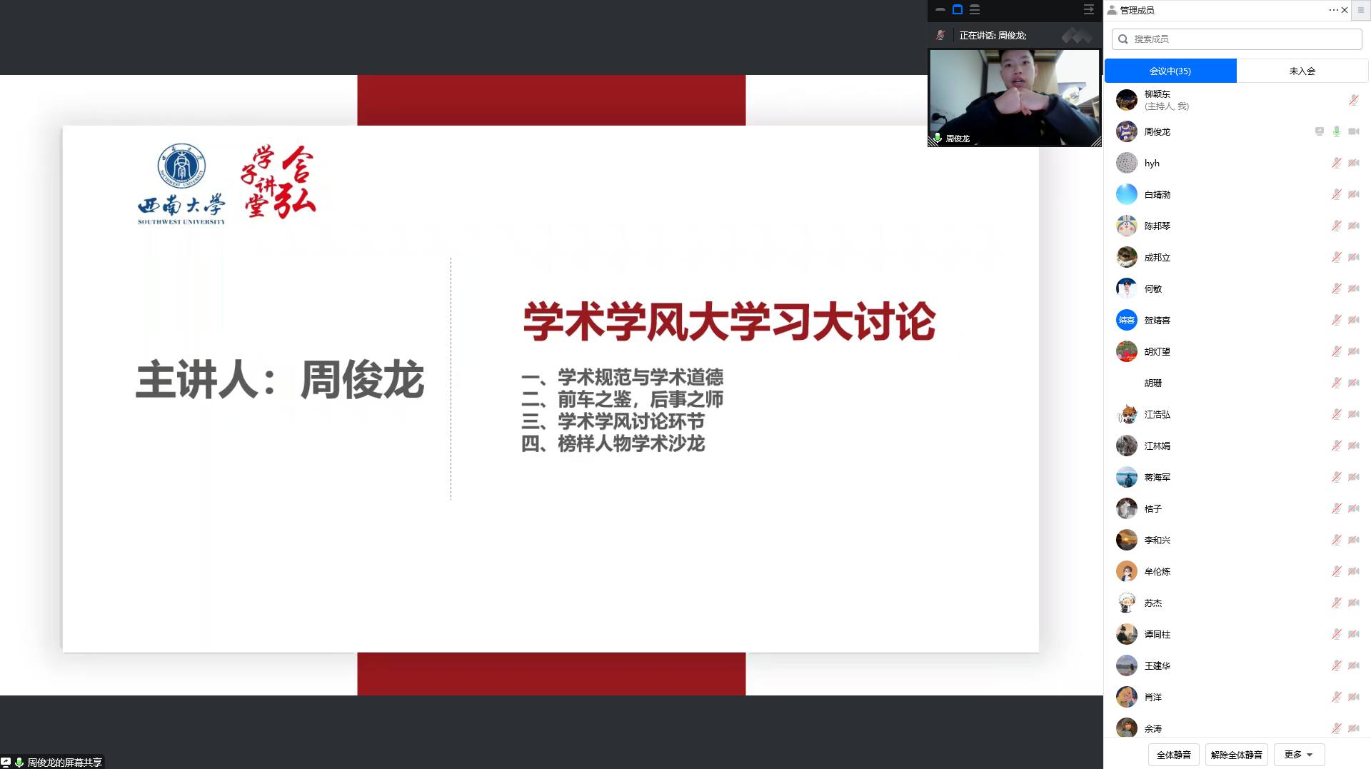 周俊龙同学首先以《教育部关于严肃处理高等学校学术不端行为的通知》《高等学校预防与处理学术不端行为办法》《PA视讯学位论文作假行为处理实施细则》等文件为依据,给大家界定了学术不端行为的概念以及对学术不端行为的处理办法。之后,他分析了翟天临、重庆师范大学彭建军、明尼苏达大学Sylvain Lesne等国内外典型的学术不端案例。最后,他引用习近平总书记的要求,要“耐得住寂寞,经得起诱惑,守得住底线,立志做大学问、做真学问”,勉励大家坚守学术初心。