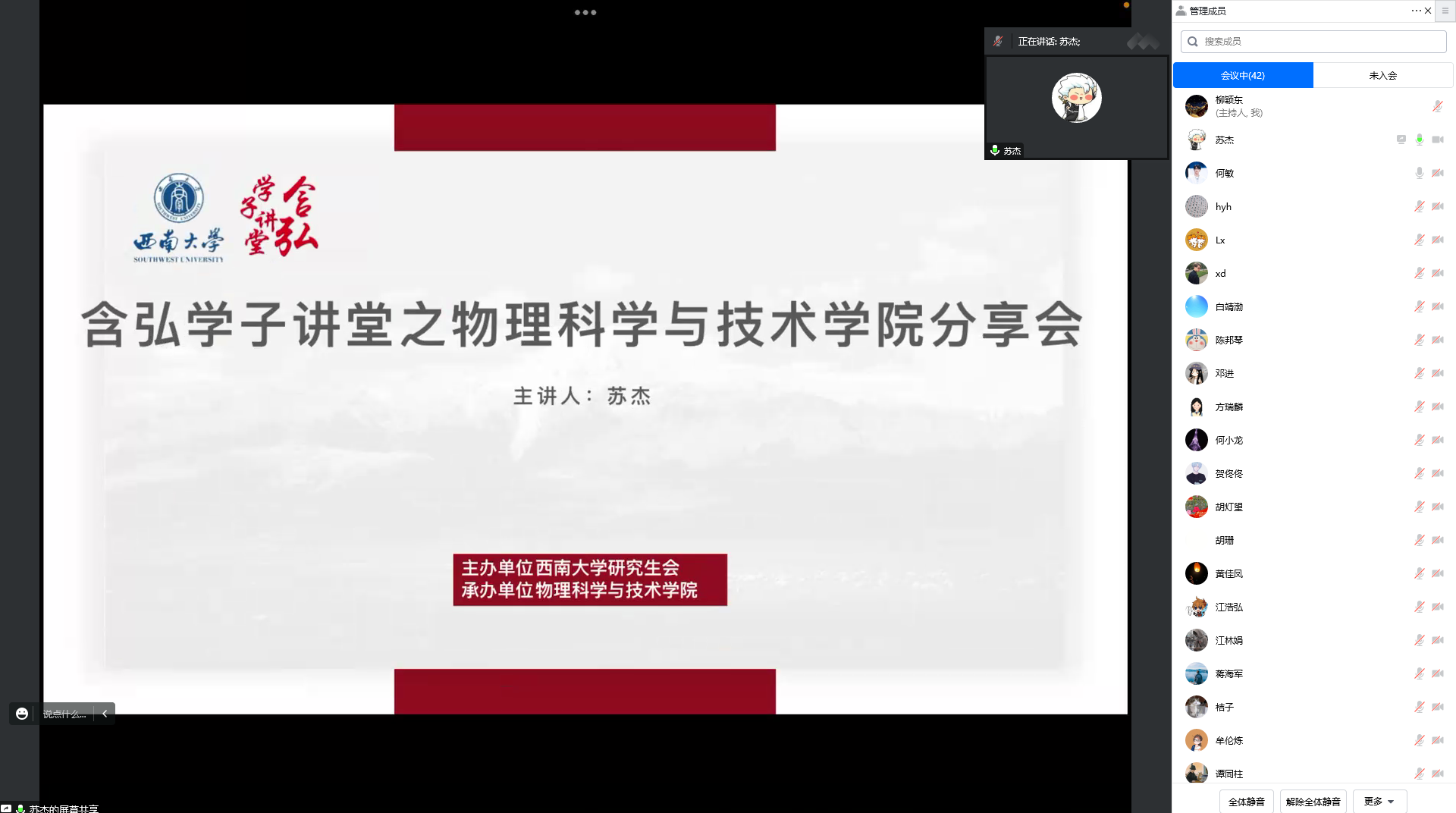 2022年12月3日晚,含弘学子讲堂之物理科学与技术学院“求真务实,开拓创新”学术道德与学风建设分享会在线上举行。本次分享会由来自物理科学与技术学院2022级理论物理专业研究生周俊龙、2021级凝聚态物理专业研究生胡远鸿、2020级光学专业研究生苏杰、2020级理论物理专业研究生王建华担任主讲人,学院研究生会成员以及2022级全体研究生参加了此次分享会。