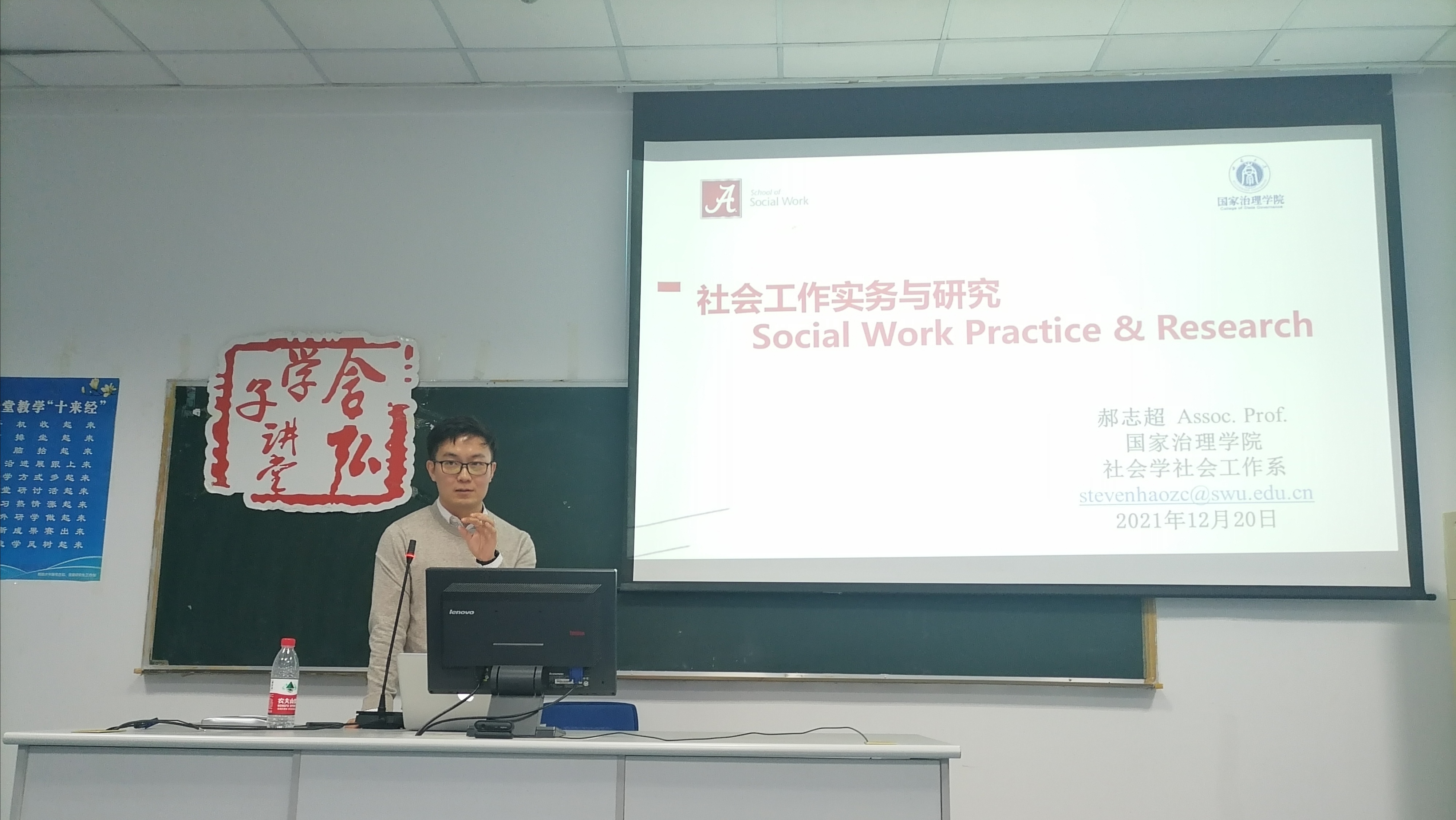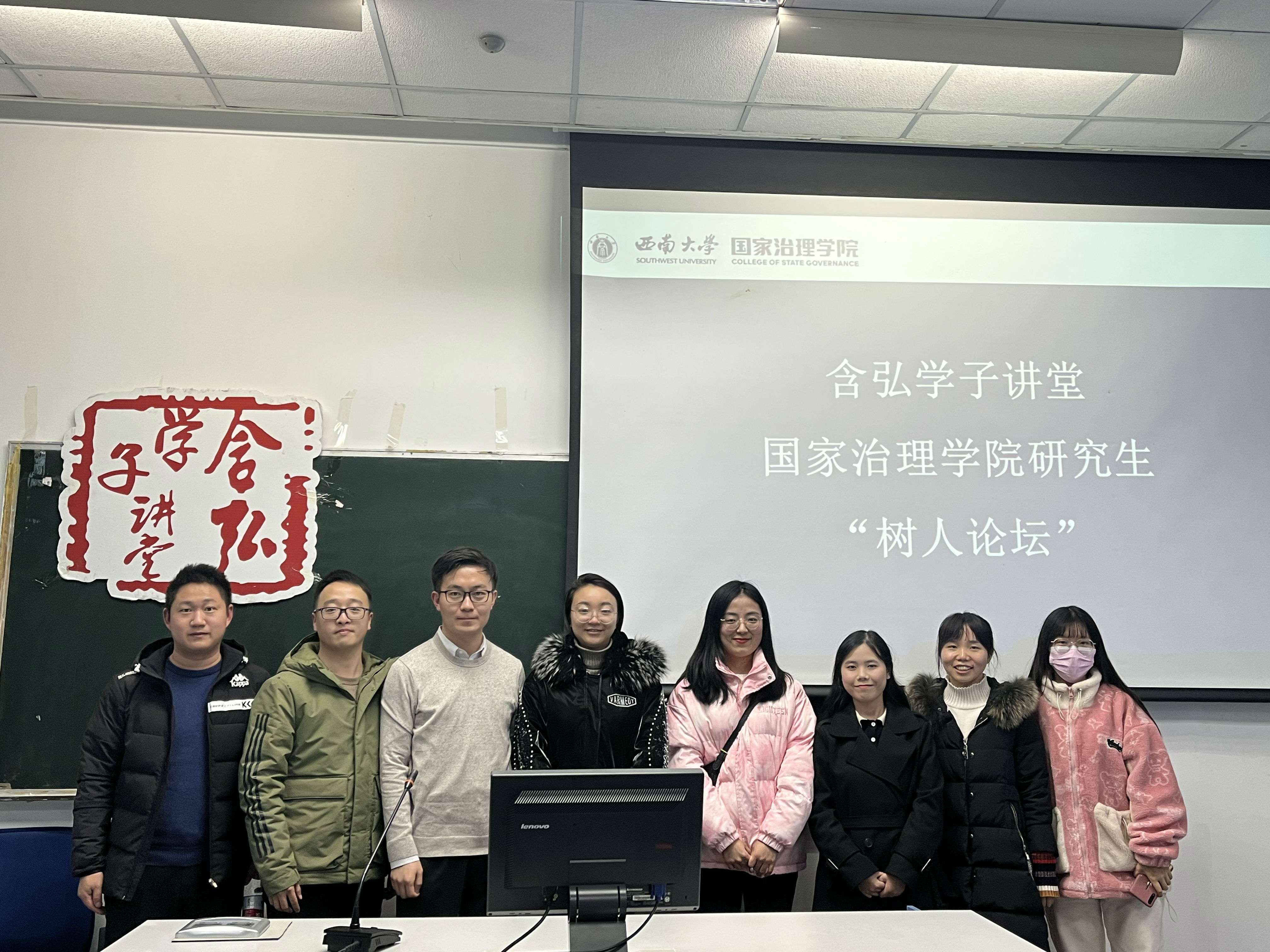 2021年12月20日晚,含弘学子讲堂之国家治理学院树人论坛“从田野走向研究——专业硕士行动研究漫谈”分享会在漱冥楼202教室举行。本次分享会由国家治理学院研究生辅导员汪全洲主持,国家治理学院教师郝志超、国家治理学院2020级治理学研究生何立冬、国家治理学院2020级社会工作专业研究生余华淋担任主讲人,学院研究生会以及2021级社会工作专硕全体成员参加了此次论坛分享会。