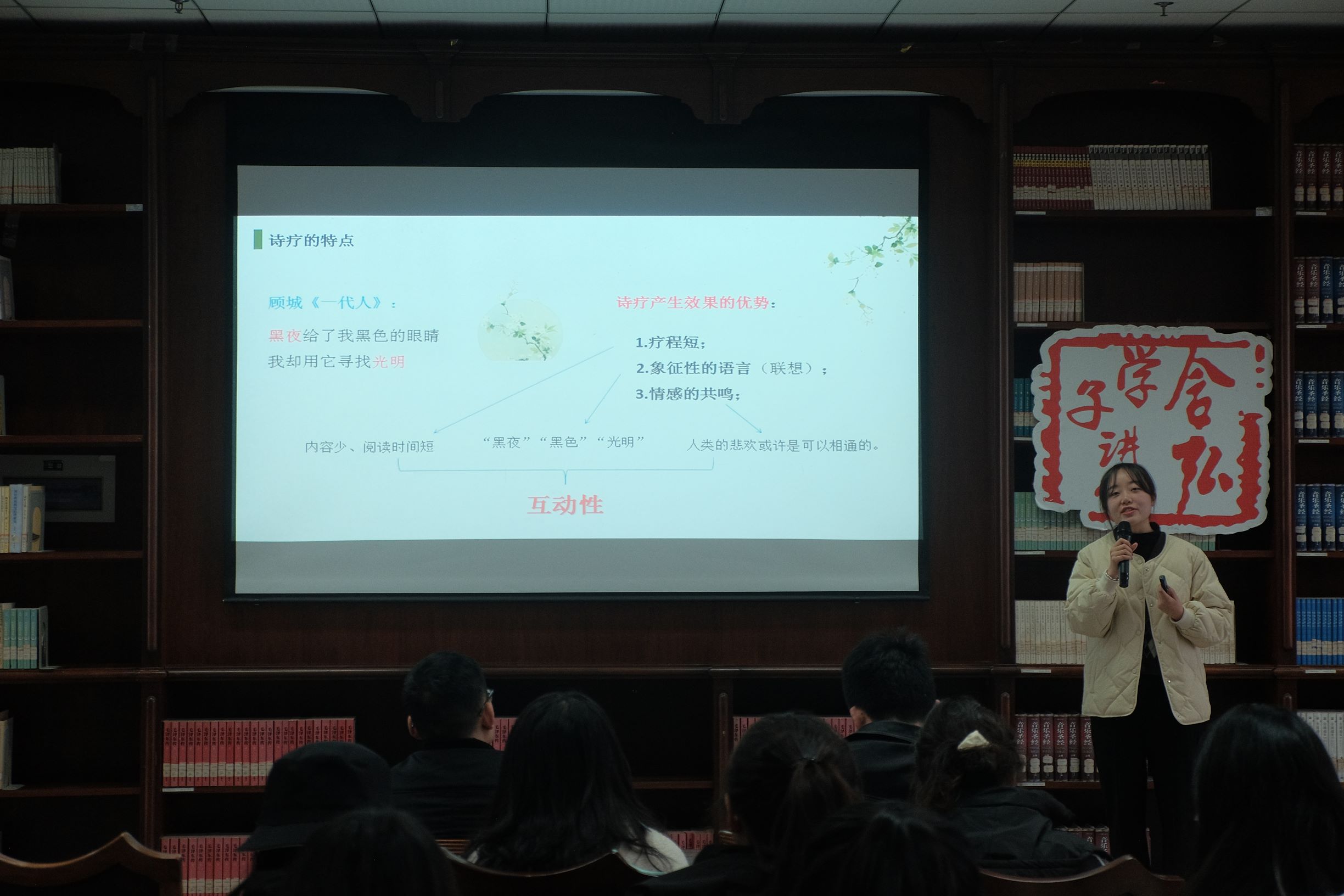 贺云玲带大家一起了解了诗歌疗法。这是一种将心理学与文学巧妙结合的独特疗法,具有疗程短、语言象征性、情感共鸣强的特点。她总结了诗歌疗法具有的独特意义,并对如何在情绪低落时采用该方法疏导情绪进行了指导。