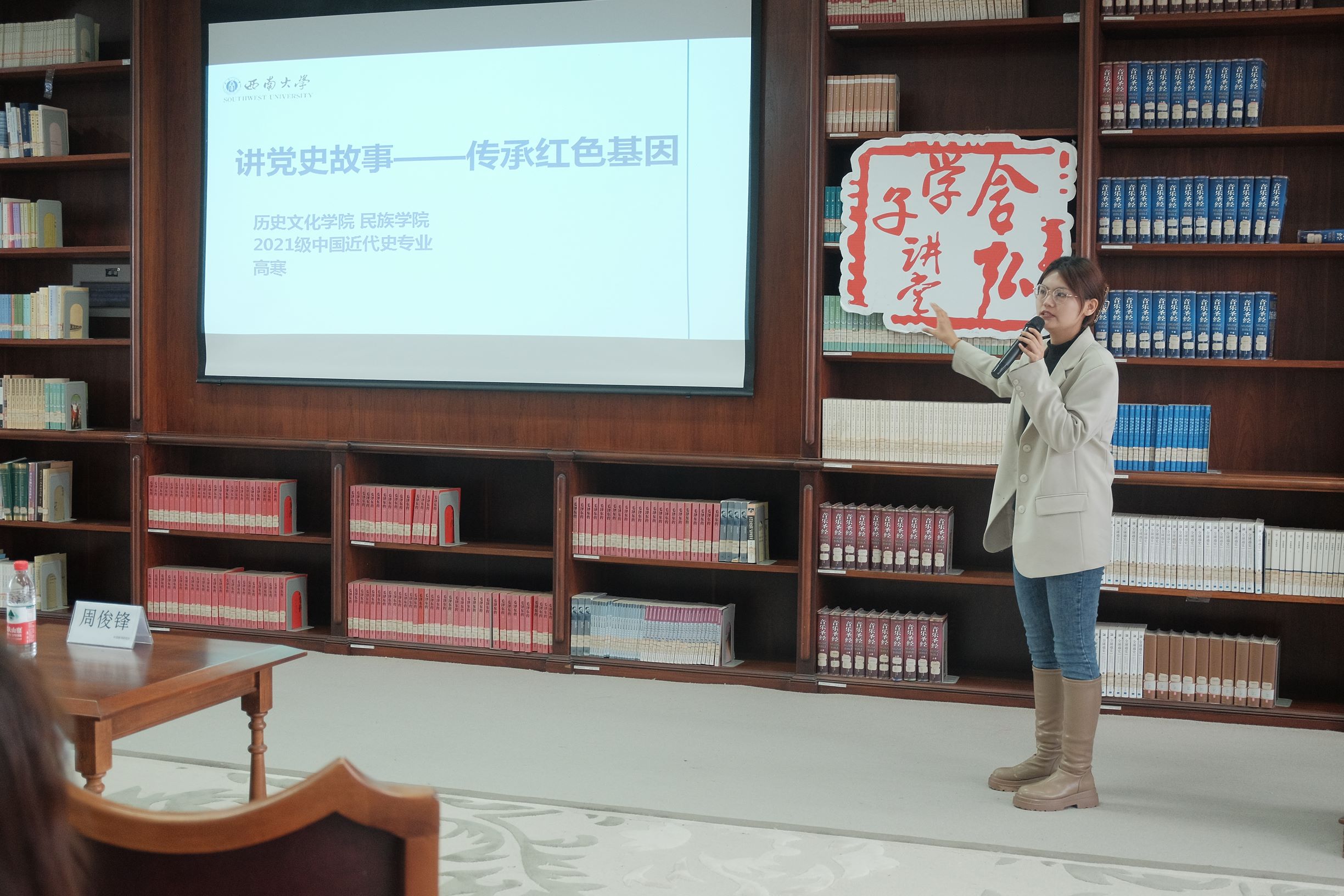 高寒介绍了井冈山革命根据地的相关背景,回顾了红军二万五千里长征的历史,分享了在此背景下发生的许多党史小故事如《一根灯芯的故事》、《一袋干粮》、《飞夺泸定桥》、《强渡大渡河》,最后她总结了长征胜利的意义,呼吁作为新时代接班人的青年要弘扬长征精神,传承中国共产党人坚如磐石的理想信念以及和衷共济的爱国情怀。