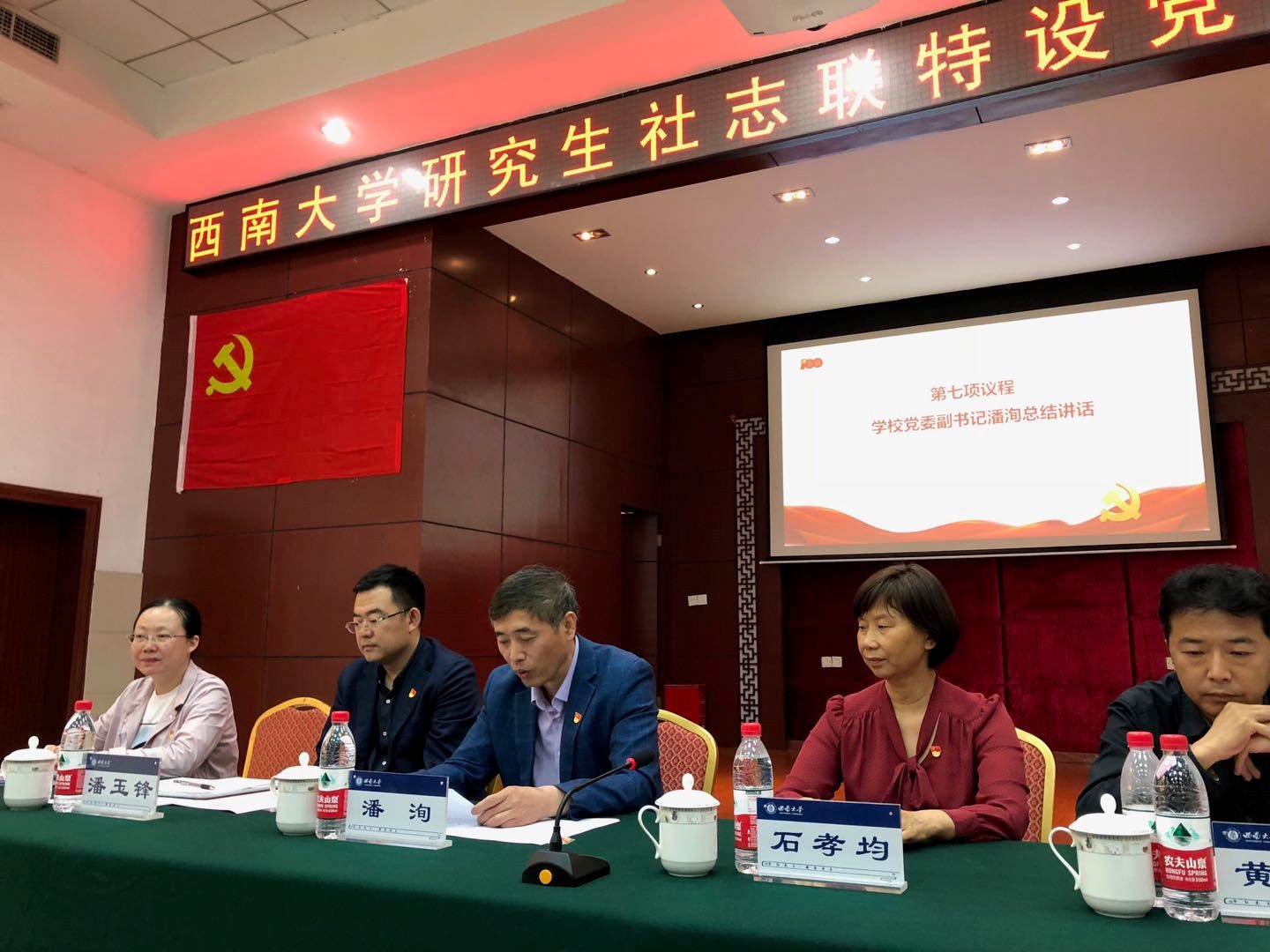 学校党委潘洵副书记的总结讲话将大会推向高潮。潘书记代表学校,向研究生社志联特设党支部的成立表示热烈的祝贺,对近年来研究生实践育人工作取得的突出成绩表示肯定。潘书记指出,研究生社志联特设党支部承担着引领全校研究生志存高远、脚踏实地,不畏艰难险阻,勇担时代使命的职能,责任重大、使命光荣。