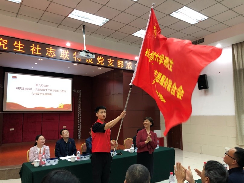 随后,研究生院院长、党委研究生工作部部长石孝均为特设党支部授旗。支部党员代表接过这面承载着梦想、使命、责任、嘱托的鲜红旗帜,扛起了这份沉甸甸的责任,并表示绝不辜负组织的信任和重托。