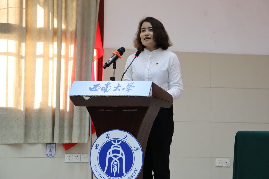 紧接着,支部党员代表、外国语学院2019级硕士研究生穆海热姆·哈得尔发言。热姆谈到,在全国各地喜迎建党百年华诞、全党上下深入开展党史学习教育之际,能够加入研究生社志联特设党支部,并担任首届支委,她感到无比光荣和自豪。热姆代表支部全体成员作出郑重承诺:在今后的各类社会实践、志愿服务活动中,将以身作则,冲锋在前,充分发挥共产党员的先锋模范作用,辐射带动其他研究生同学积极追求进步,更好地肩负起新时代赋予我们的责任和使命。