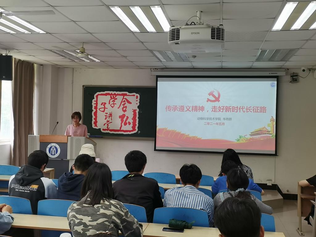 韦艳群分享了遵义会议、四渡赤水战役、娄山关大捷和苟坝会议等党史上的重要事件,从事件的背景、过程和意义入手,并通过播放遵义会议和娄山关战役的实景演出视频,使同学们更加深刻的了解当时的情况。提出当代的青年应当传承弘扬遵义精神,走好新时代长征路,不辜负这个伟大时代赋予我们新时代青年的历史使命和责任担当。