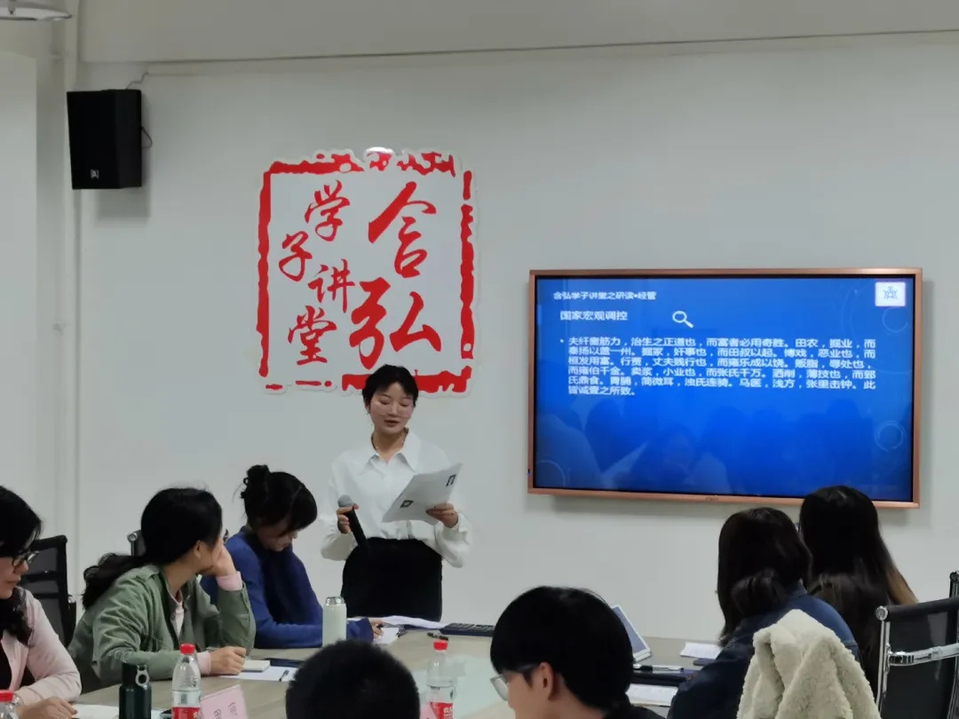 2020年11月18日晚,含弘学子讲堂之经济管理学院“研读•经管”读书会第三期在经济管理学院A408会议室举办。本次读书会由2020级农村发展硕士研究生黄滢洁主持,由2019级金融学专业硕士研究生祝露西、2019级农业管理硕士研究生郇宜达担任主讲人,学院党委副书记田丽担任点评老师,实习辅导员任娟、第十五届研究生团总支研究生会全体成员参加。