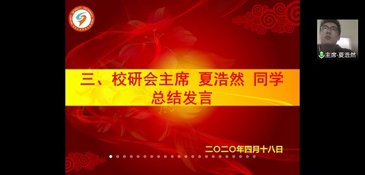 最后,校研会主席夏浩然同学进行总结发言。他表示各位研会代表从多角度、多方面分享的国家安全知识对于帮助我校研究生建立完备的国家安全知识体系具有重要意义,并指出当前疫情防控虽取得阶段性成果,但仍存在一定风险,全校学生应继续注重个人防控,强化爱国之心,以习近平总书记提出的总体国家安全观重要战略思想为遵循,努力开创国家安全的新局面,为实现“两个一百年”奋斗目标、实现中华民族伟大复兴的中国梦贡献出我们西大研究生学子的力量。