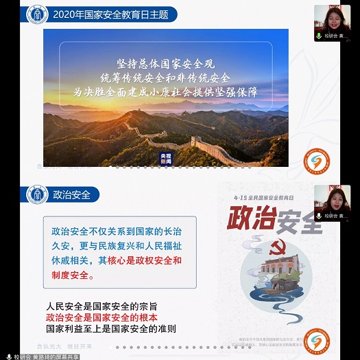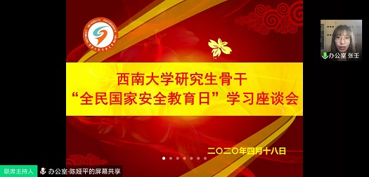 2020年4月15日是第5个“全民国家安全教育日”,为增强总体国家安全观普及力度,推动国家安全宣传教育工作深入开展,增强研究生骨干的国家安全意识,在党委研工部指导下,4月18日下午,PA视讯研究生骨干“全民国家安全教育日”学习座谈会通过腾讯会议顺利召开,校研会主席团及部门负责人、各二级研会主席团代表参会,会议由校研会办公室负责人张壬同学主持。