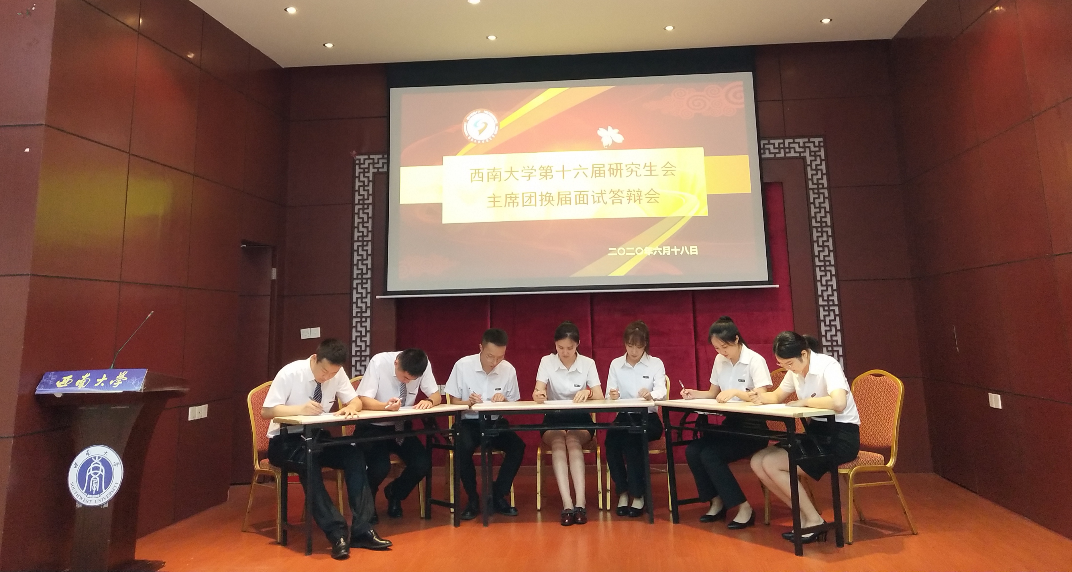 6月18日下午,主席团换届面试答辩会在八一礼堂举行。党委研究生工作部相关科室负责人以及第十五届主席团全体成员出席面试答辩会。通过自我介绍、主旨演讲、无领导小组讨论等环节考察了主席团候选人对研会工作的了解程度及统筹规划、临场应变和口头表达能力。评委老师和主席团成员随后通过多角度提问,对各位候选人进行了全面细致的考察。下午5时许,面试答辩会正式结束。
