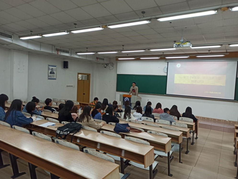 会议伊始,校研会主席夏浩然同学提出要建设一支深入同学、有奉献精神、全面发展的优秀干部队伍,明确研究生会干部的职责和义务,确保研会全体干部能协调好上下级关系并出色完成工作。他带领全体干部认真学习《学生会、研究生会干部自律公约》,指出研究生干部应时刻以高标准要求自我,发挥先进模范带头作用。