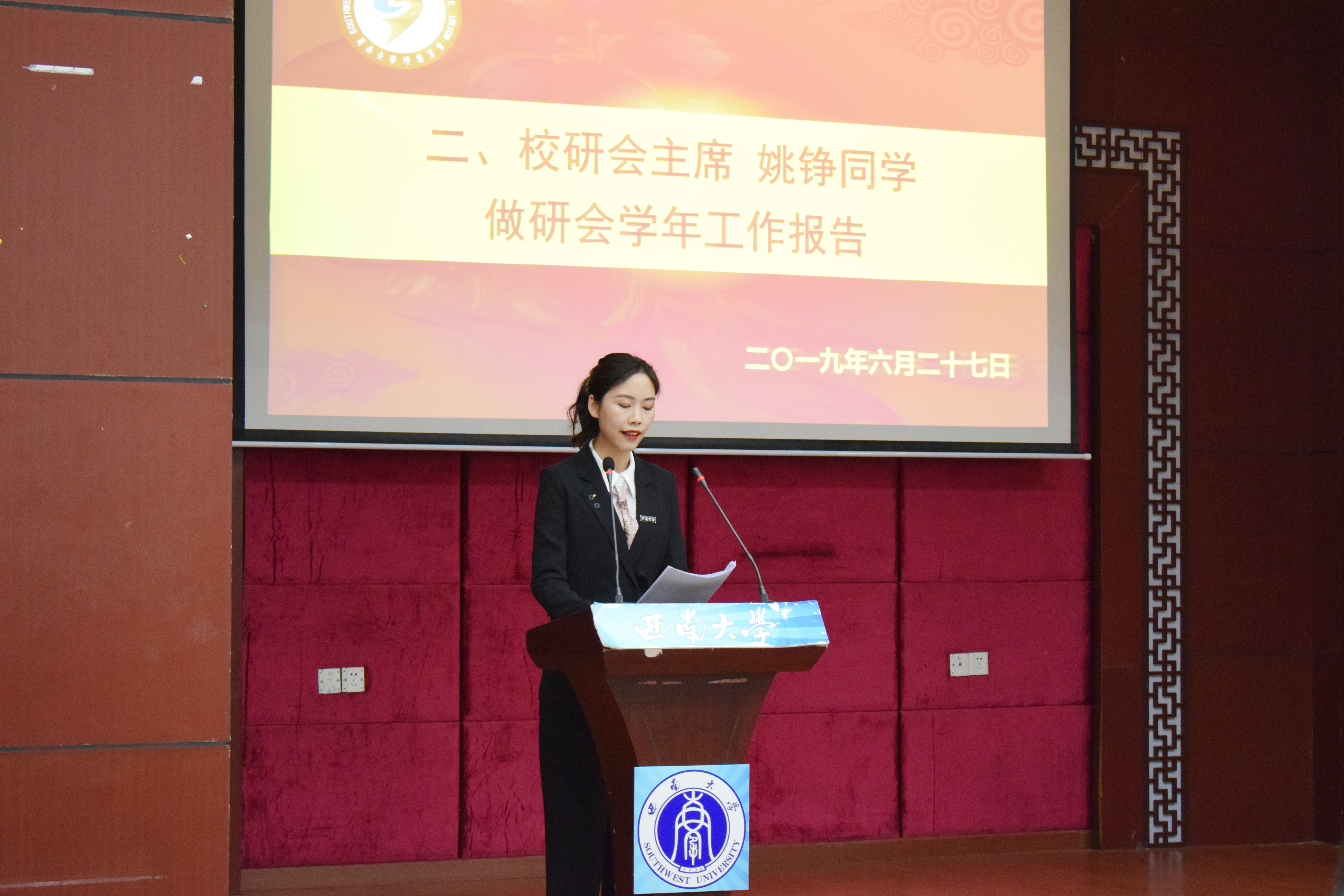 会议伊始,全体参会人员通过视频回顾了本学年校研会举办的系列活动,一帧帧画面记录着校研会全体成员的共同努力与拼搏。随后,第十四届校研会主席姚铮同学以《牢记初心使命,深化服务意识,争做研学先锋》为题,就组织建设、组织育人、校园文化、实践服务及合作交流五个方面对研会学年的工作予以总结,总结报告内容详实、亮点突出,发言热情洋溢,赢得阵阵掌声。