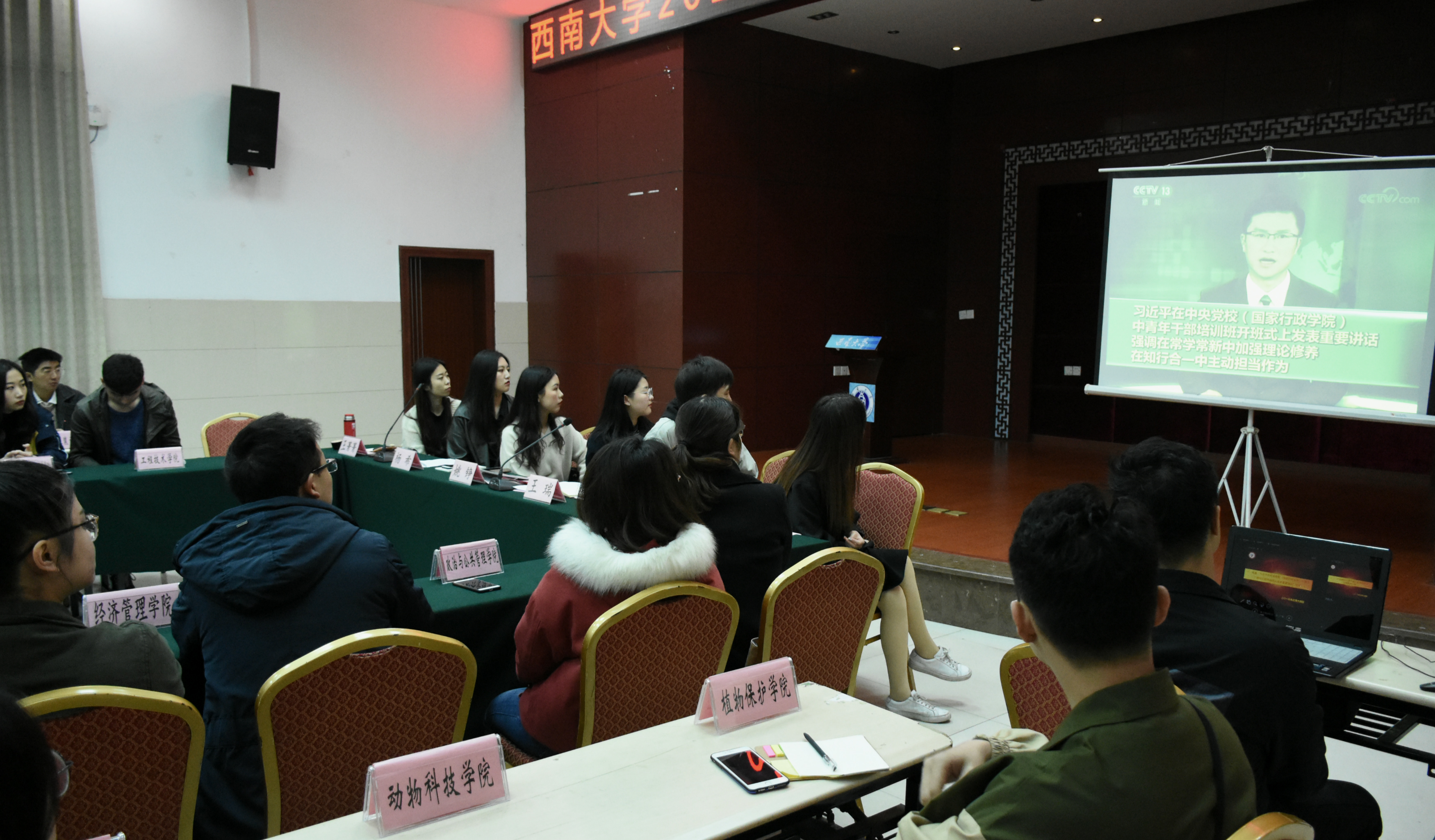 会议伊始,同学们一起学习了习近平总书记在中央党校(国家行政学院)中青年干部培训班开班式上发表的重要讲话,他提出要在常学常新中加强理论修养、在学思践悟中牢记初心使命、在细照笃行中不断修炼自我、在知行合一中主动担当作为。观看结束后,校研会主席姚铮同学表示:“我们作为青年学生干部要牢记习近平总书记的谆谆教诲,加强理论学习,提高德才修养,主动担当作为,为实现中华民族伟大复兴的中国梦贡献青春力量。”