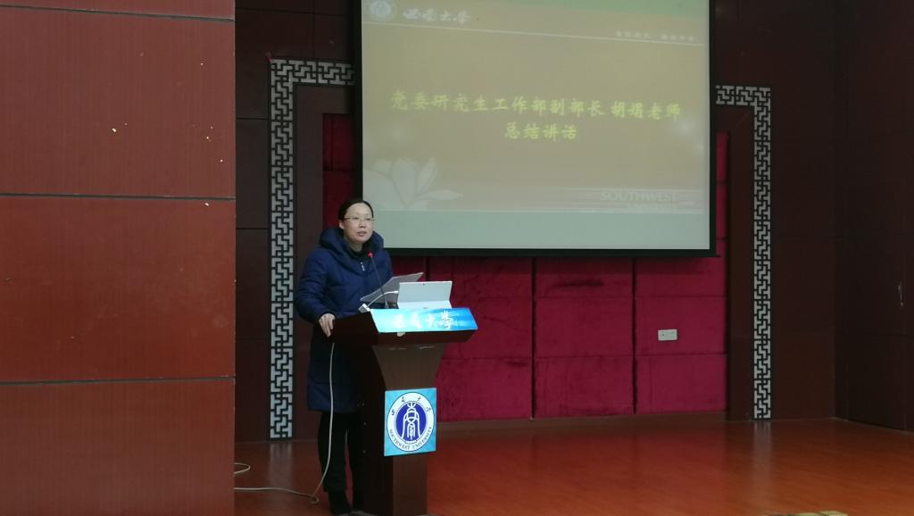 最后,胡娟副部长作总结讲话。胡娟副部长首先介绍了学校“百所山村小学计划”研究生社会实践品牌活动的开展情况:已在6个省份54所山村小学建立了实践基地,形成了长期定点帮扶关系,以支教形式为依托,充分了解偏远山区留守儿童的现状,并为其提供思想引导、学业辅导、生活指导、心理疏导等关爱服务。