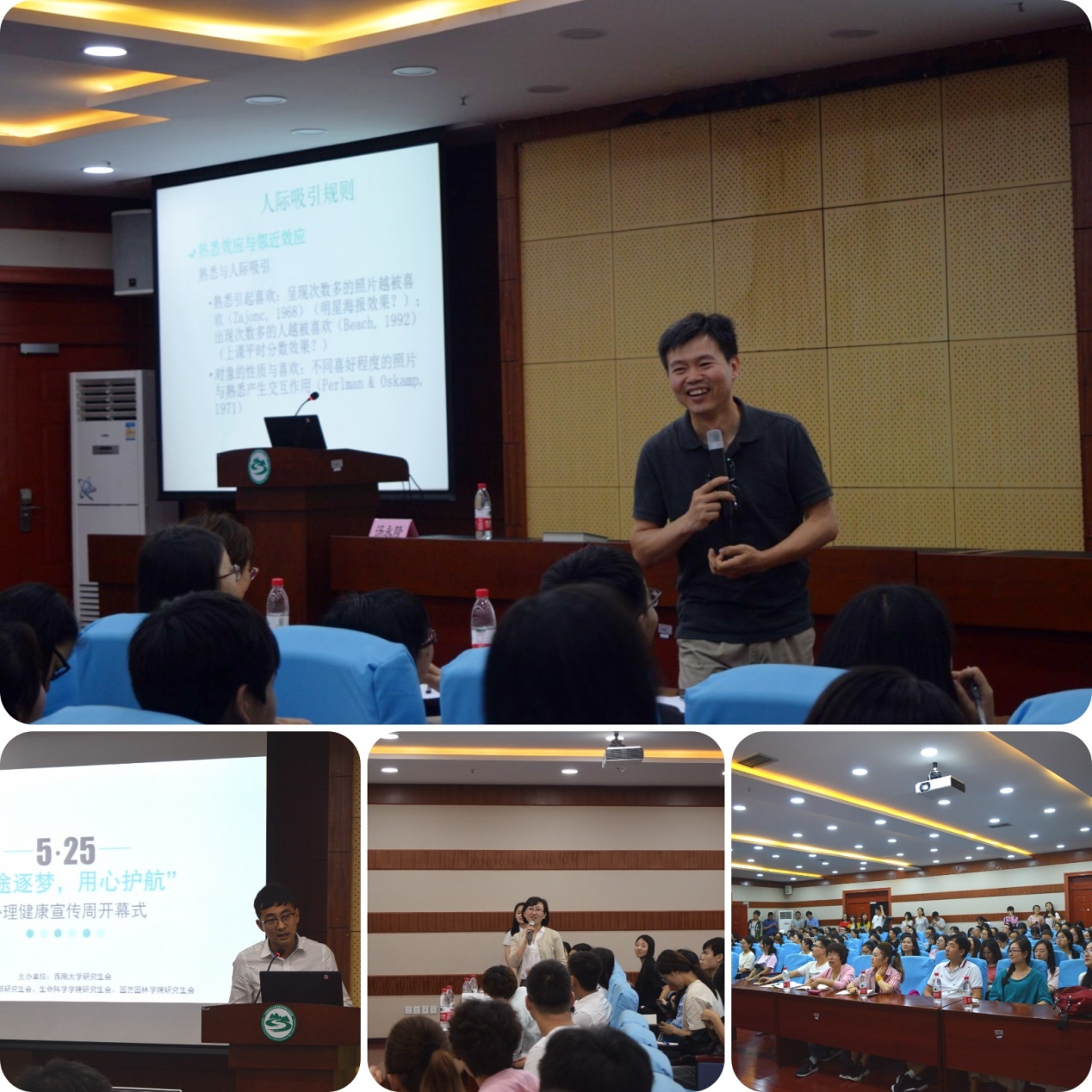25日,开幕式在第二十九教学楼215教室成功举办。开幕式上,我校研究生会主席易君杰同学发表致辞,并预祝此次活动取得圆满成功。随后,心理学部应用心理学系主任汤永隆教授举行专题讲座“谈情说爱话人际”。汤教授首先用三个趣味生动的提问引出讲座主题——人际关系,又分别从人际关系的熟悉效应与邻近效应、人际空间距离以及居住相邻性与人际吸引等方面,全方位梳理人际关系中的点点滴滴。最后从爱情三角理论、爱情类型、苏格拉底的麦穗论,以及斯滕伯的“爱情是什么?”为我们讲述人际关系中最亲密的关系——爱情,并形象生动讲解了“练爱与恋爱”的区别。讲座结束后,心理学部研究生辅导员苏缇老师总结讲座内容,并呼吁在场同学积极参加5.25其他系列活动,此次讲座在热烈的掌声中圆满结束。