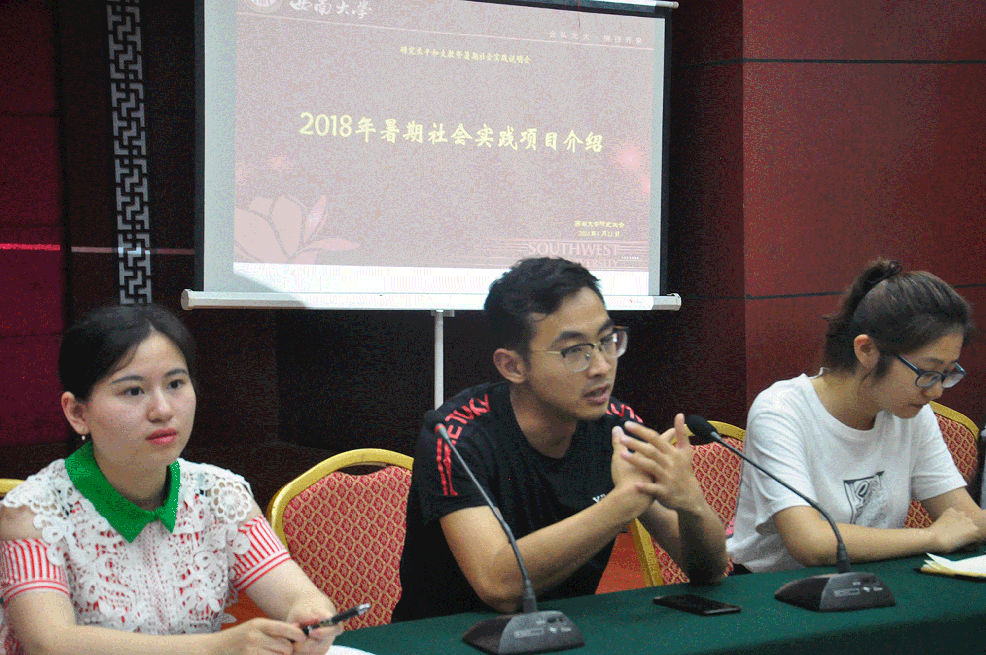 说明会伊始,校研会主席易君杰同学从项目的背景、进展、人员、意义等方面系统的介绍了研究生平和支教的相关事宜。随后,第一期“研究生平和支教团”的四位同学进行了工作汇报,分享支教生活。高士泽同学重点就其在福建平和支教过程中的基本情况和课堂教学风采进行汇报;徐志强同学从校园生活、民风民俗、名胜古迹等各个方面回顾了他的和平支教经历;叶露欣同学提到了她在支教中与学生们相处的点滴和收获;刘云露同学则对她在平和二中支教的经历、感想做了汇报。四位报告人恳切的话语,朴实的感悟让在场人员深受感动,纷纷提问交流,现场气氛活跃。最后,易君杰同学介绍了2018年研究生暑期社会实践的思路与重点进行了说明,并分别介绍了“百名博士防城港行”、珙县挂职锻炼、“百名博士泗洪行”、“蓝火计划”等实践项目的基本情况,并现场答疑。