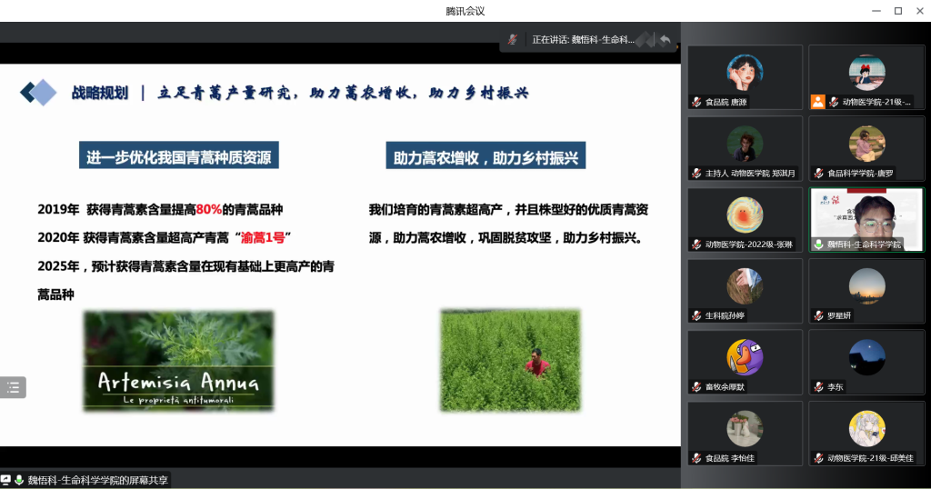 魏悟科同学以“青蒿优良种质资源选育和创制的研究”为主题,分享了课题组在青蒿选种育种方面的成果,让大家感受到培育出高产值高速度高附加值青蒿资源的来之不易,感受到生科人帮助农产增收、帮助世界人民获得抗疟最有力武器的赤诚初心。