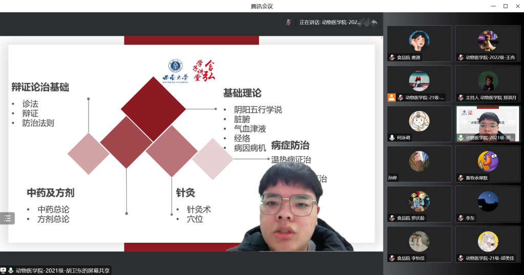 胡卫东同学从中兽医的概念、应用、优势、乡村振兴四个方面阐述了中兽药的绿色效能,即减少耐药性以及提高动物生产性能,并强调了中兽医对畜禽疾病控制的有效作用,展现了中兽医学科的完整性和系统性。