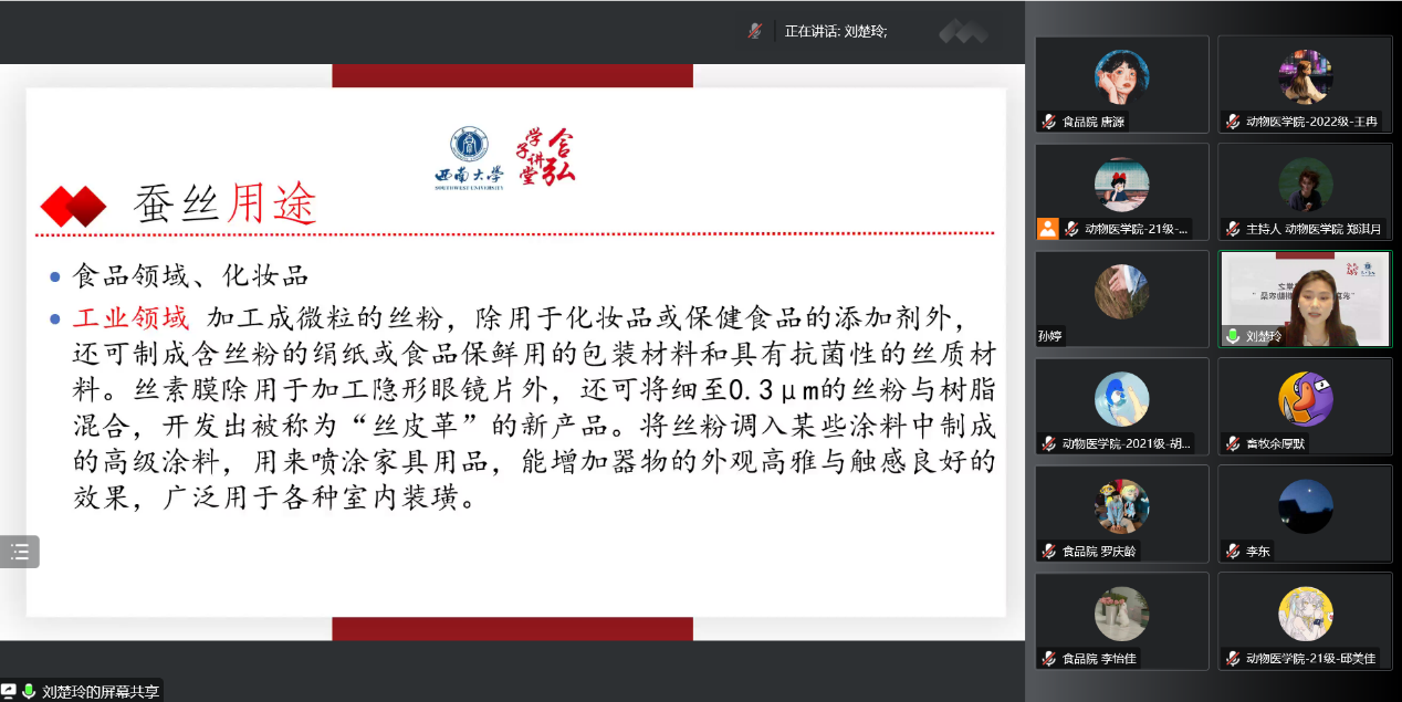 2022年12月18日下午,由PA视讯研究生会主办,蚕桑纺织与生物质科学学院研究生会、动物科学技术学院研究生会、动物医学院研究生会、生命科学学院研究生会、食品科学学院研究生会联合承办的含弘学子讲堂在线上举行。本次活动以“求真西大人,躬耕助农桑”为主题,蚕桑院2021级生物与医药专业硕士研究生刘楚玲、动科院2020级畜牧专业硕士研究生何泳萌、动医院2021级兽医专业硕士研究生胡卫东、食品院2021级食品加工与安全专业硕士研究生唐罗以及生科院2021级植物学专业博士研究生魏悟科担任主讲人,动医院郑淇月同学担任主持人,共邀请250余名同学参与了本次讲座。