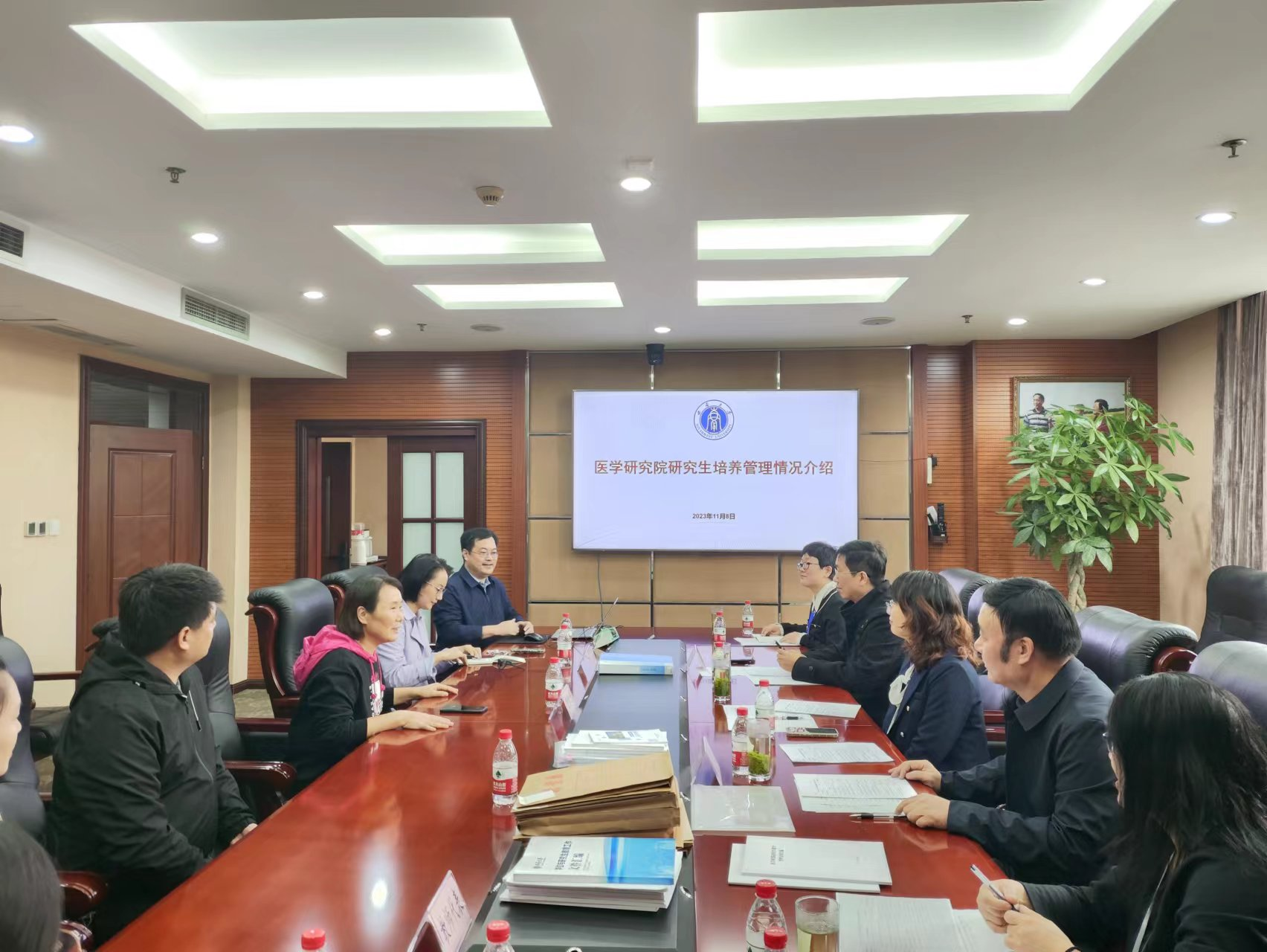 医学研究院崔红娟副院长、刘同宝教授、魏福静辅导员等对学院学科建设、实验室平台、专硕培养、研究生奖助体系、教师培训交流、培养方案修订及思想政治教育方面进行了介绍。督导调研工作组就学院的专业硕士学位研究生异地培养及学位论文答辩、校外导师、导师实验室科研项目开展及国家社会科学基金申请、研究生参与国际学术会议等情况开展了交流。杨丹副院长对学院基金项目、人才队伍建设成果及招收全日制硕士研究生的行动计划给予高度肯定,强调了研究生培养过程中学生思想政治教育的重要性,希望学院进一步强化师资力量及研究生培养各个环节,落实研究生教育高质量发展。