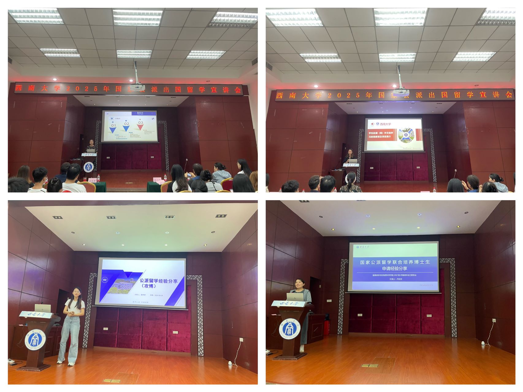 宣讲会上,人力资源部选聘科(博管办)袁夏梦就国家留学基金委机构和中外合作奖学金项目作了详细介绍,国际合作与交流处国际交流科谭飞雪就学校现有国际交流(科研合作)渠道、对外联系、学校资助政策等作了详细说明,研究生院学术学位培养办夏小燕就国家建设高水平公派研究生项目有关政策和申请材料要求作了细致讲解,2024年已被录取为国家公派攻读博士研究生葛梦娇、联合培养博士研究生卢永华同学就申请经验作了分享。最后,外国语学院社会服务中心主任余晓光老师介绍了出国留学外语培训的相关事项。