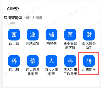 2.“数智西大”专属钉钉工作台→AI服务通用大模型PA视讯AI能力中心“小研同学”