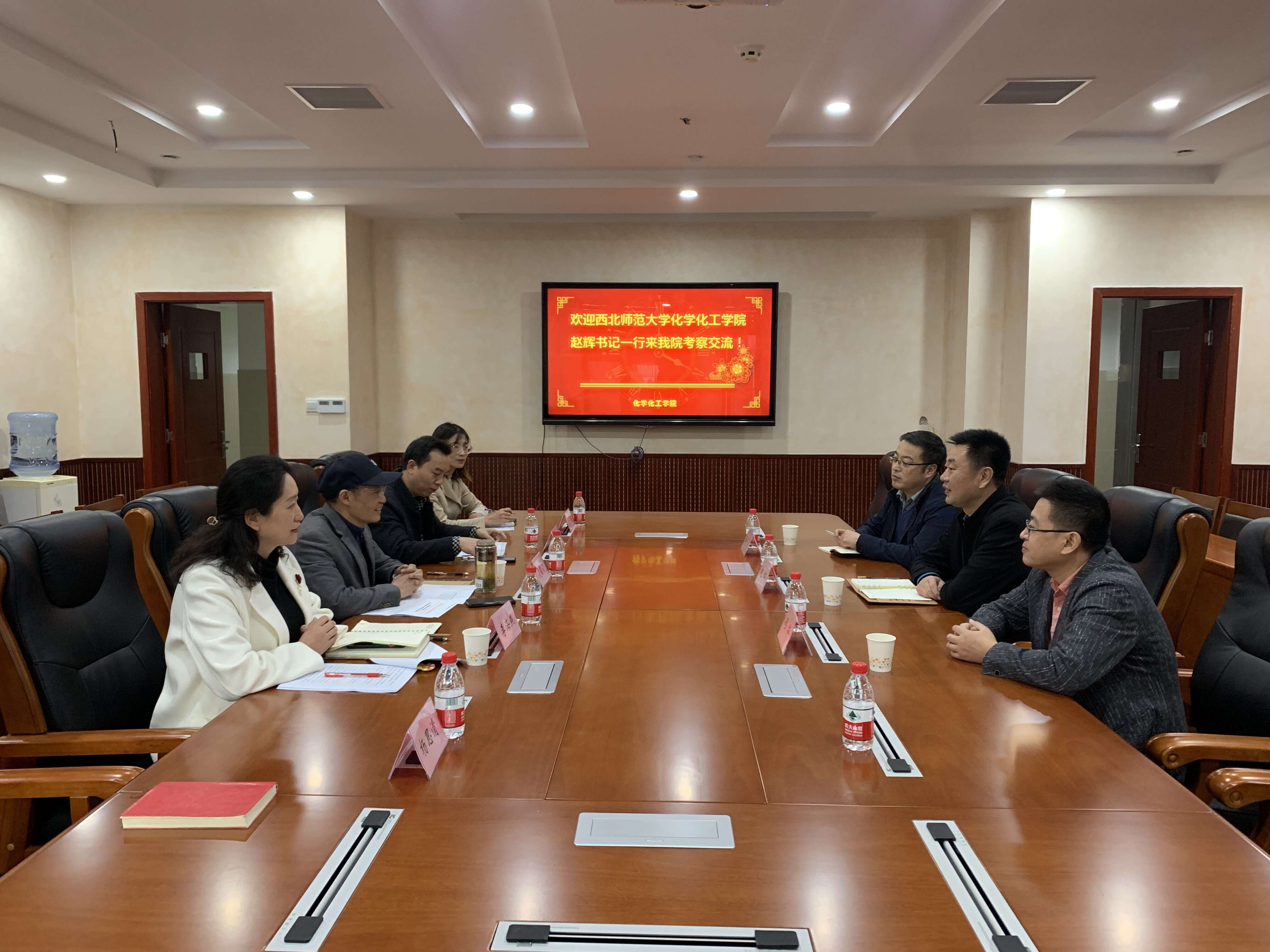 2020年11月18日上午,西北师范大学化学化工学院党委书记赵辉、副院长薛中华、化工系主任冯华一行莅临我院考察交流。学院党委书记夏德全、党委副书记、纪委书记李海燕、副院长何荣幸、教学秘书张小芳、研究生辅导员杨思清出席了交流座谈会。