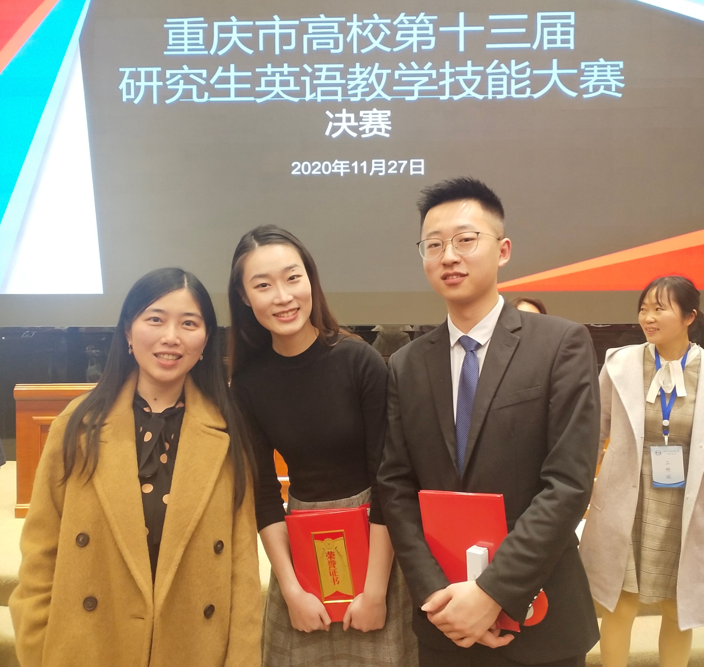 11月27日下午19点,重庆市高校第十三届研究生英语教学技能大赛决赛在四川外国语大学宏文楼二楼国际报告厅举行。来自重庆市5所高校的10名选手参加了本次终极角逐。激烈比拼之下,我院2020级研究生王琛琛获一等奖以及最佳教案奖,教师教育学院2020级研究生李周志雄获三等奖。