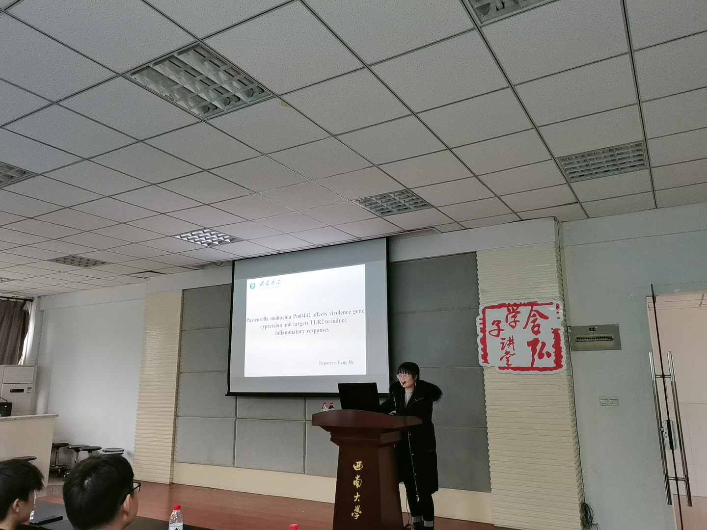 主讲人何芳,2019级博士研究生,主讲题目是《多杀性巴氏杆菌Pm0442影响毒力基因表达,靶向TLR2诱导炎症反应》。讲堂上,她对在校期间相关研究进行了汇报,她用词精炼、逻辑清晰,在提问环节,同学们热情高涨,纷纷询问读博的经历、如何处理科研和生活之间的关系以及实验相关问题等。她热情地回答了同学们的问题,并给大家提供了一些建设性的意见和观点。