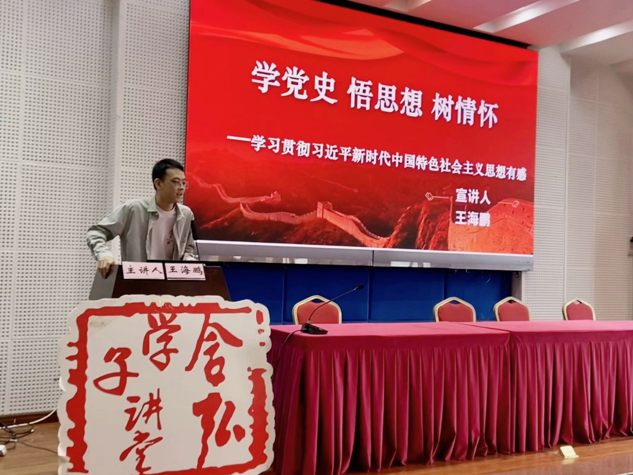 王海鹏同学从学党史、悟思想、树情怀三个方面分享了其在学习贯彻习近平新时代中国特色社会主义思想中的感悟与思考。首先他总结概括了习近平新时代中国特色社会主义思想的内容。其次在“学党史”方面,他不仅讲述了自己的入党初心以及对“做人做事做学问、尽心尽力尽责任”的学院精神的理解,也对“七一勋章”获得者黄文秀表达了崇高的敬意。再次在“悟思想”方面,他引用习近平总书记的重要讲话阐释了科学理论的重要性。最后在“树情怀”方面,他认为青年作为“早晨八九点钟的太阳”,要展现出朝气蓬勃的活力、“青出于蓝胜于蓝”的风采,在新时代的广阔天地中书写青春华章。