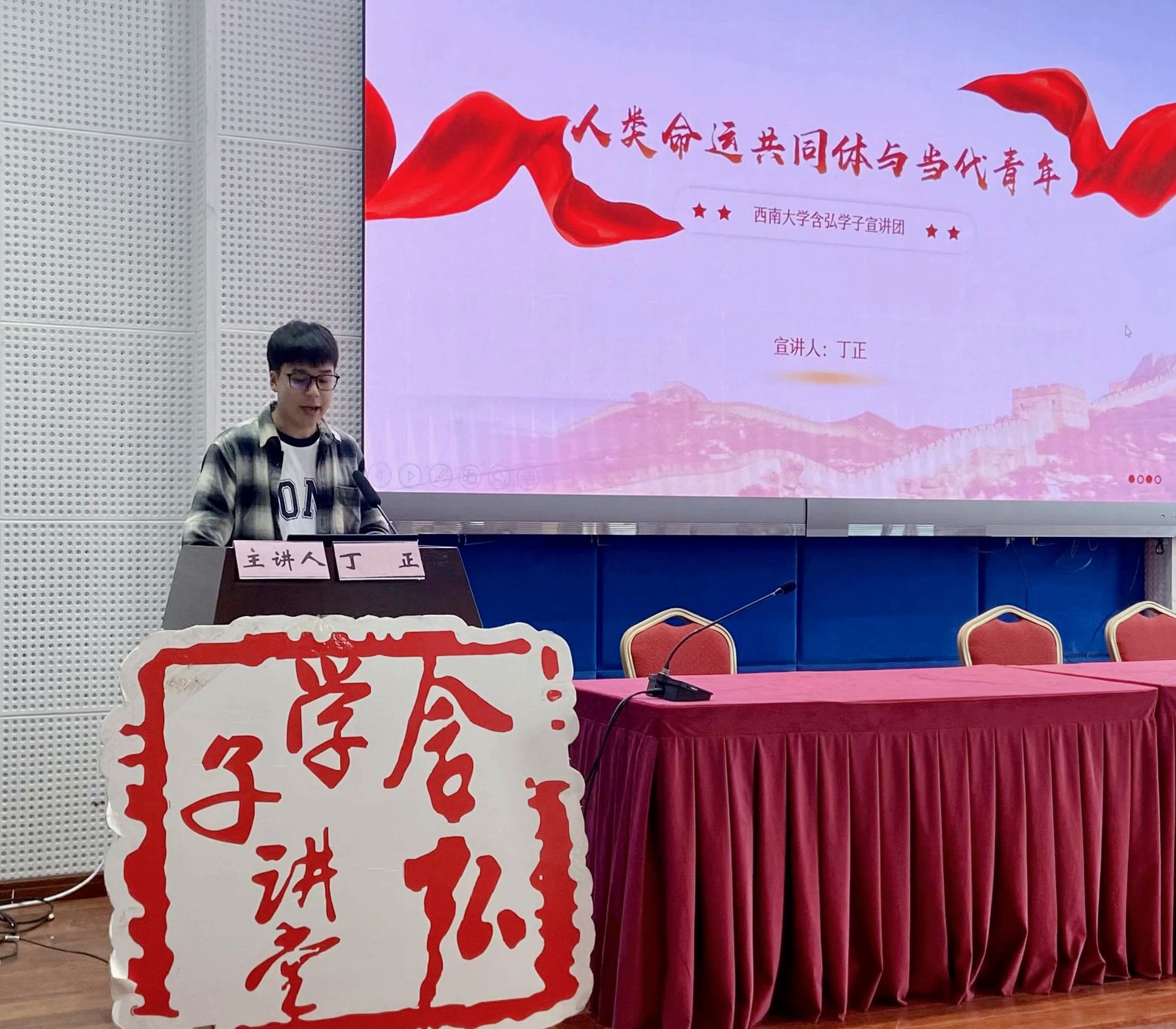 丁正同学以人类命运共同体为主线,分别讲述了“交往”与人类命运共同体,“天下大同”与人类命运共同体,“当代青年”与人类命运共同体。在“交往”与人类命运共同体部分,他结合自身的学术研究,讲述了交往的内涵以及二者的关系。在“天下大同”与人类命运共同体部分,他讲述了“大同社会”的出处、梳理了习近平总书记关于“人类命运共同体”的相关论述,进一步指出二者之间的辩证关系。在“当代青年”与人类命运共同体部分,他强调新时代的青年要激发青春动力、展现青春活力、扩大青春影响力、汇聚青春合力,争做人类命运共同体的参与者、建设者、传播者和贡献者,为构建人类命运共同体彰显青春力量。