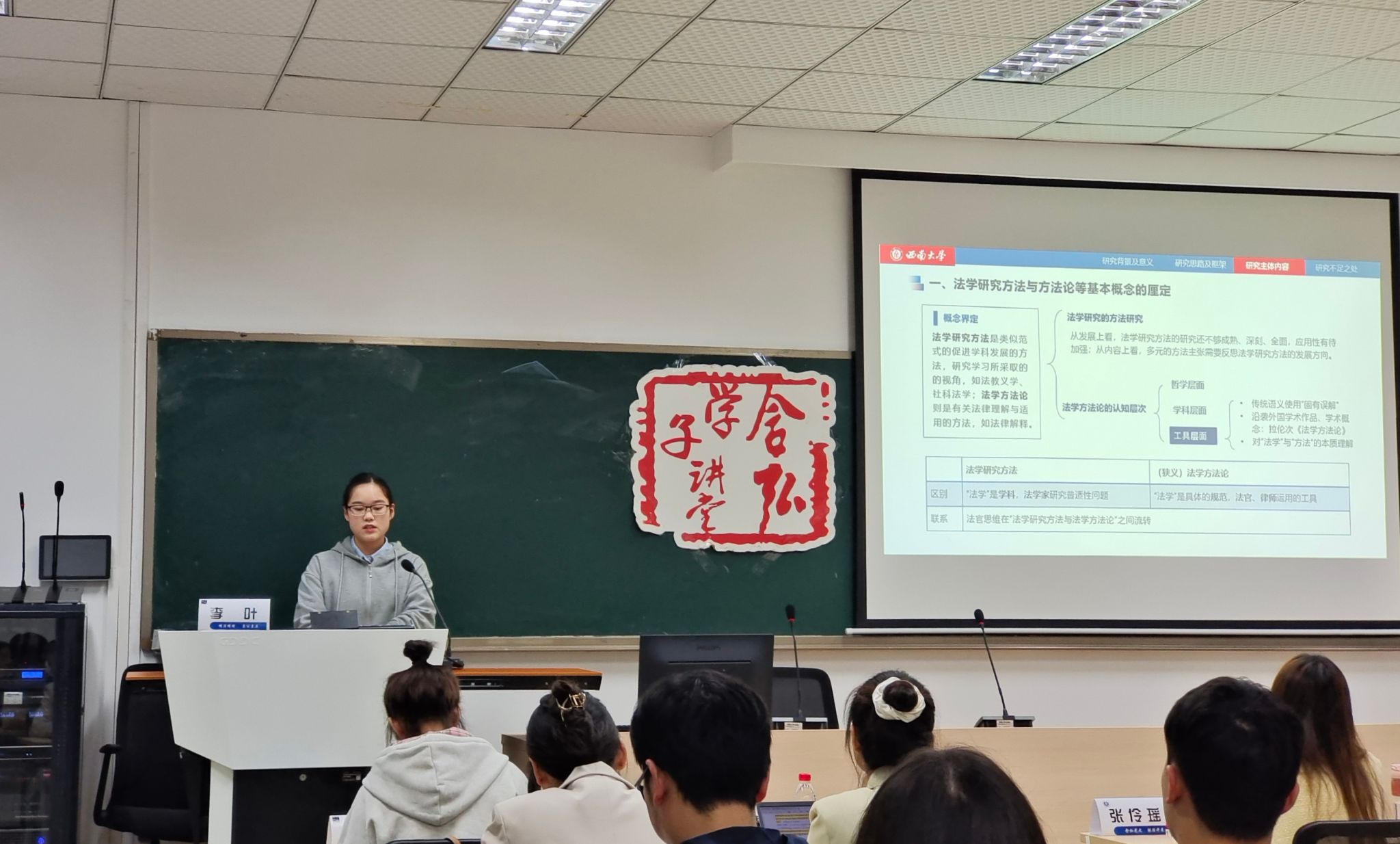 法学院2022级刑法学硕士研究生李叶同学进行了题为《多元法学研究方法的学术考察》的主题分享。分享伊始,李叶同学首先以法学研究方法早期与现在存在之不足,引出法学研究方法的重要性和法学研究方法的未来发展方向。在此研究背景和意义上,其从工具层面出发认识法学方法论。接着阐述了研究的主体内容,一是厘清法学研究方法与方法论等基本概念,认为不能将法学研究方法与法学方法论混同使用,二者存在区别;二是体系化介绍主要法学研究方法,提出法教义学与社科法学都是追寻法学的科学路径;三是阐述主要法学研究方法与定性定量研究的互动;四是基于我国法学研究现状,认为应提倡以法教义学为中心,社科法学面向实证研究的法学研究方法的定位。最后,指出了自己研究的不足之处。