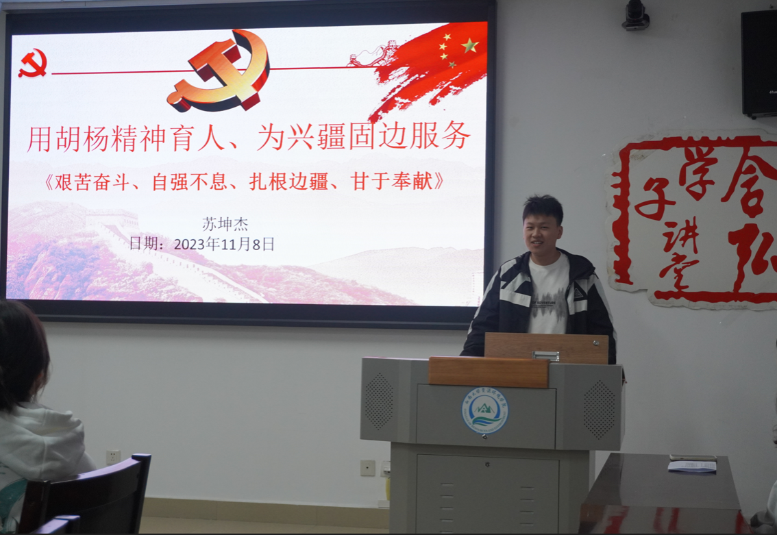 苏坤杰同学为大家分享的主题是“用胡杨精神育人,为兴疆固边服务”。通过对胡杨精神内涵和价值的学习,我们折服于胡杨“生而千年不死,死而千年不倒,倒而千年不朽”的顽强生命力,它的特质成为了中国西部地区的文化符号。胡杨精神不屈不挠,坚韧不拔,顽强拼搏的品质,必将影响一代又一代。它鼓励着我们保持乐观的姿态,不管遇到什么困难和挫折,都要坚持不懈地追求理想和信念。