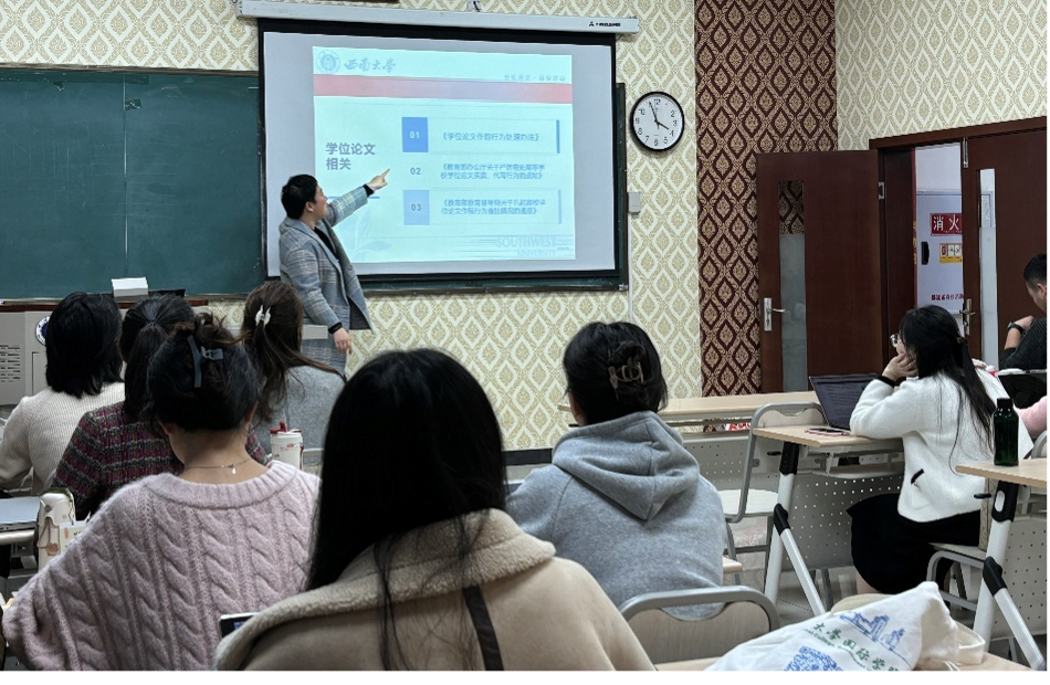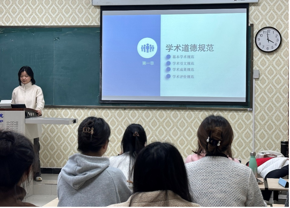 为净化学术环境、规范学术行为、明确学术责任,学院邀请了范媛媛老师就学位论文、科研诚信与学术规范等学术知识进行了专题讲座,引导全体同学在力求学术创新的同时严格遵守学术规范,坚守学术诚信,杜绝学术不端行为,坚守科研道德底线。