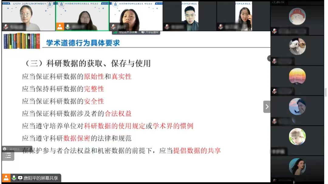 11月10日下午,经济管理学院组织研究生观看了“学术不端与科研诚信”线上专题讲座。本次讲座分为由中国知网学位论文部的编辑张雅丽老师和陈梦老师分别主讲的科技论文和社科论文两个部分。同学们就讲座内容进行了热烈的交流和讨论。本次讲座的开展,对推进学校科研诚信建设、营造风清气正的学术生态起到了积极促进作用。