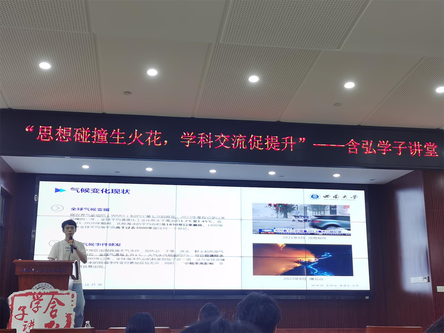 地理科学学院的戴依轩同学以“全球气候变化对人类社会带来的影响和挑战”为主题,探讨了全球气候变化现状、气候变化的成因、以及全球气候变化对我们的社会、经济和生态系统造成的巨大的影响,同时讨论了全球气候变化所带来的挑战,寻找应对这些挑战的解决方案。最后,呼吁大家为缓解气候变化做出自己的贡献,可以是通过减少碳排放,支持可再生能源,也可以是积极参与社区和政治行动。