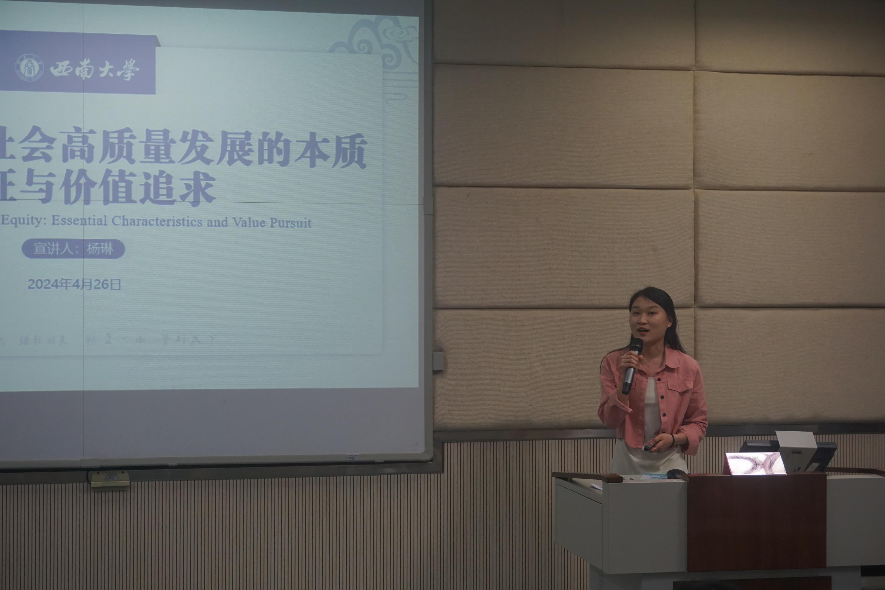 杨琳同学首先强调了高质量教育公平的基础,并从教育资源、东中西部及城乡教育、教育内在与外在价值等多个方面进一步阐释了高质量教育公平的内涵。以不同的视角,带领大家认识到了教育公平与社会高质量发展的紧密联系。