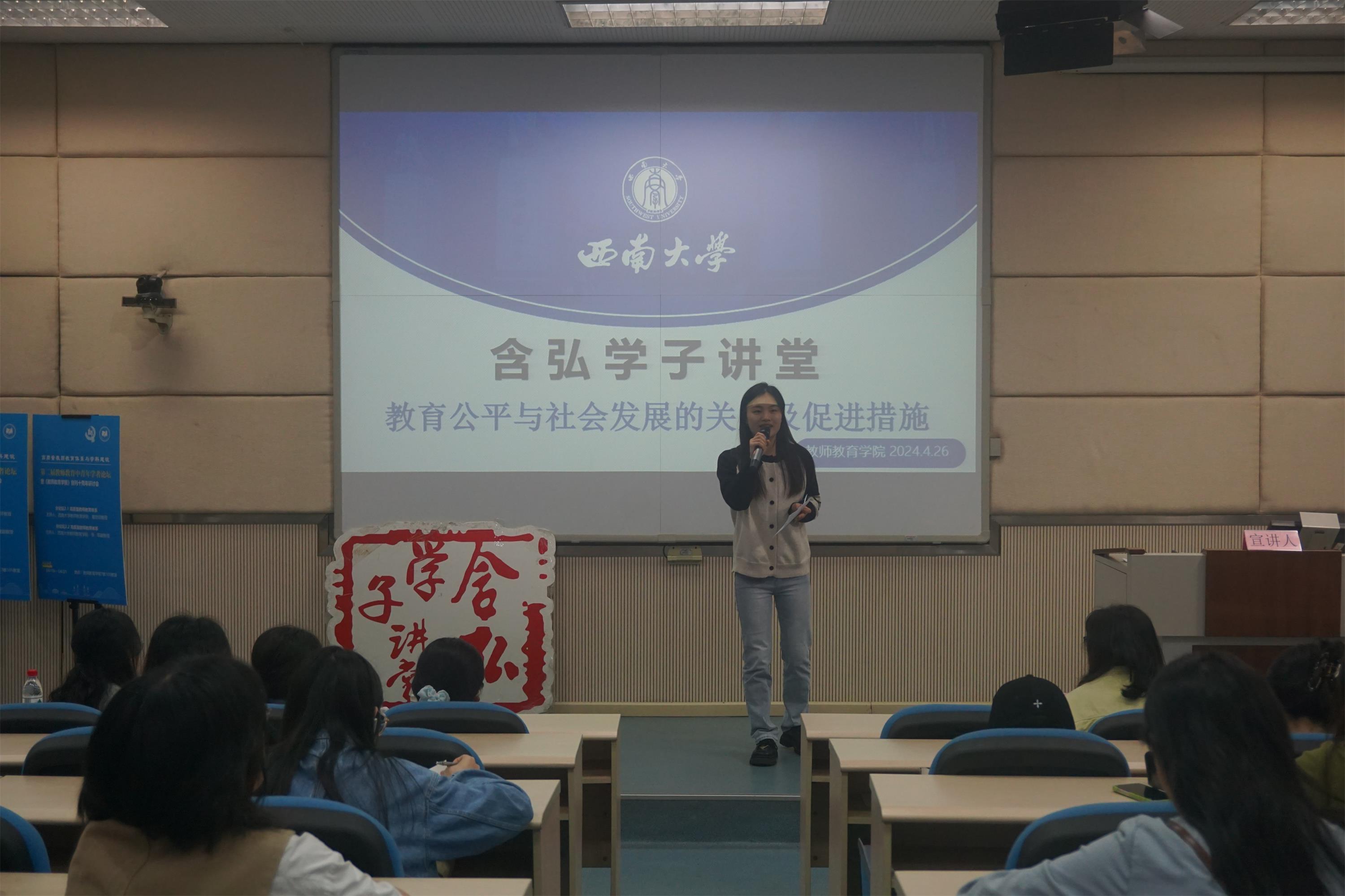 4月26日下午,含弘学子讲堂“教育公平与社会发展的关系及促进措施”分享会在教师教育学院第七教学楼101教室举行。学院团委书记郑婷老师、学院研究生参加了此次活动。