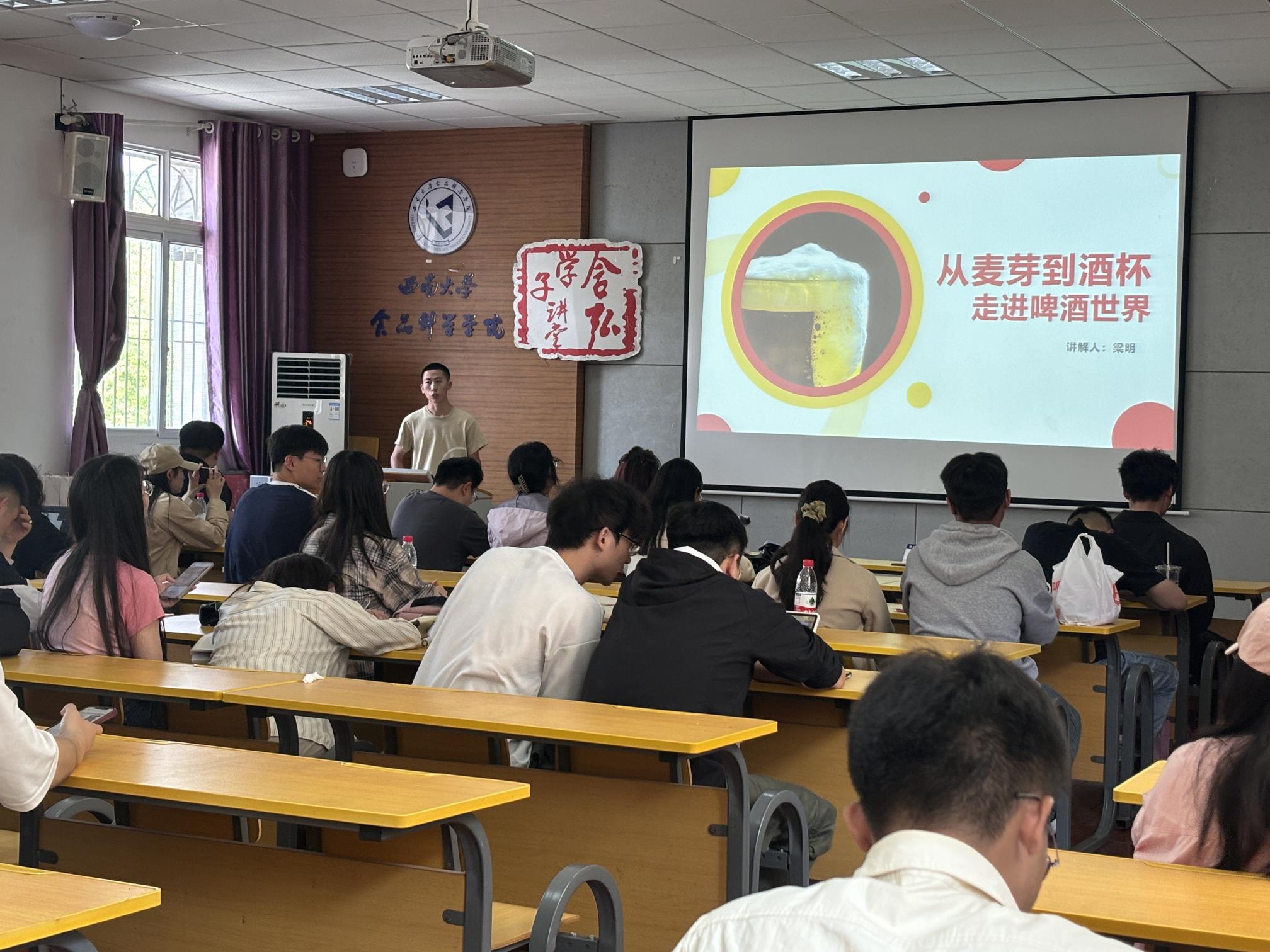 食品科学学院2022级生物与医药专业硕士研究生梁明同学带领大家了解了啤酒的基本情况。啤酒不仅是炎炎夏日消暑解渴的绝佳饮品,其中含有的维生素也可以帮助身体补充营养。但近年来许多网络博主曝光勾兑啤酒、青岛啤酒小便事件、泔水勾兑等啤酒食品安全问题屡见不鲜,食品安全任重道远。梁明同学重点介绍了啤酒的生产工艺以及在其中涉及到的食品安全环节,我们作为消费者要如何辨别好的啤酒,并且用实物展示了不同酒花,小麦以及辅料,带领大家现场评鉴不同啤酒。现场气氛轻松活跃,并且针对不同关于啤酒的问题进行解答。