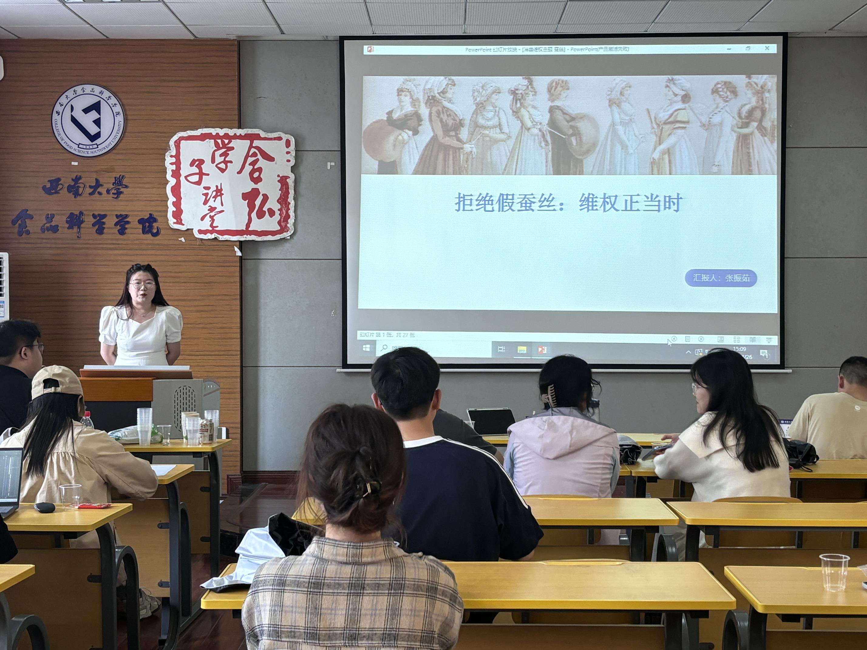 来自蚕桑纺织与生物质科学学院2023级畜牧学专业硕士研究生张振茹同学将蚕桑学与消费者权益相结合,为同学们详细讲解蚕丝被等蚕丝制品在售卖及生产过程中出现的造假、售假以及以次充好等侵害消费者权益的乱象。除此之外,张振茹同学还将站在消费者的角度,和同学们分享有效甄别蚕丝的方法。丰富而有效的甄别方法的普及,相关政策的完善,更好的遏制了假冒伪劣蚕丝层出不穷的乱象,还消费者一个安心、安全的消费环境。