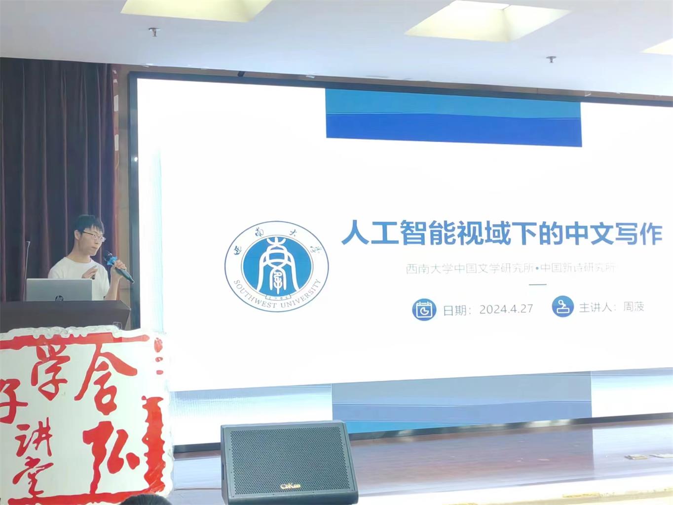 2024年4月27日上午9点,由PA视讯研究生会主办,外国语学院研究生会、中国新诗研究所研究生会联合承办的含弘学子讲堂在外国语学院903学术报告厅顺利举行。本次含弘学子讲堂主题聚焦于“启智增慧育良才 数智赋能谱新篇——人工智能与语言学科的双向赋能”,展开了一场别开生面的学术交流活动。本次活动由外国语学院2023级英语语言文学硕士研究生王佳豪、中国新诗研究所2023级中国现当代文学硕士研究生周菠、外国语学院2023级英语语言文学硕士研究生刘力嘉、中国新诗研究所2023级中国比较文学与世界文学硕士研究生张虹云、外国语学院2022级外国语言学及应用语言学硕士研究生黄莺歌担任主讲人,他们从不同维度剖析了人工智能技术如何与语言学科相互影响、共同进步,为观众描绘了一幅未来教育与文学创作的宏伟蓝图。